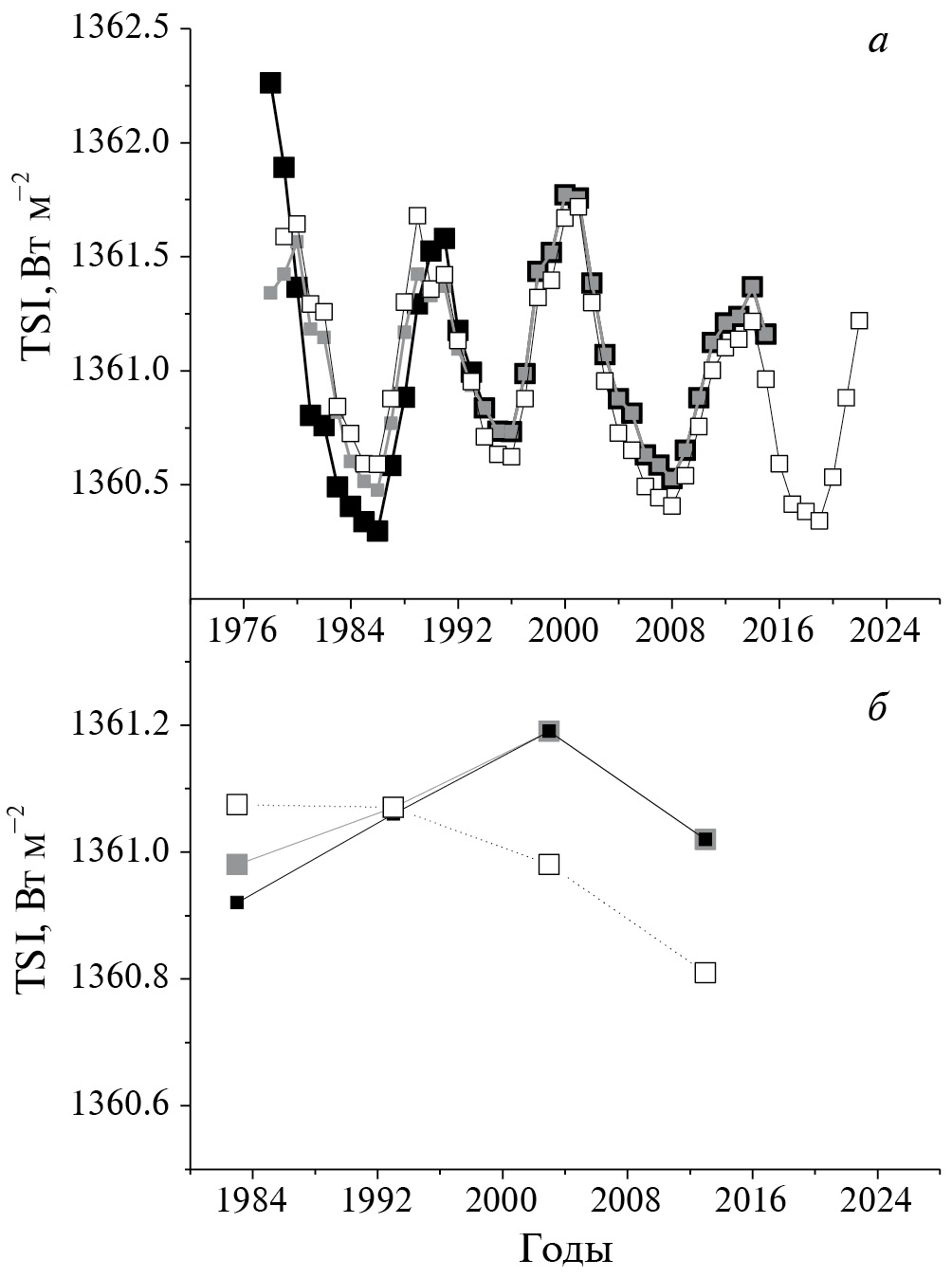 Рис. 1. (a) – усредненные за год композитные ряды данных по инструментально измеренной TSI. Черная линия с полными квадратами – нескорректированная серия TSIDU; серая линия с полными квадратами – скорректированная серия TSIDC; штриховая линия с пустыми квадратами – скорректированная серия TSIPMOD. (б) – усредненные по десятилетиям данные по инструментально измеренной TSI. Черная линия с полными квадратами – TSIDU, серая линия с полными квадратами – TSIDC, штриховая линия с пустыми квадратами – TSIPMOD.