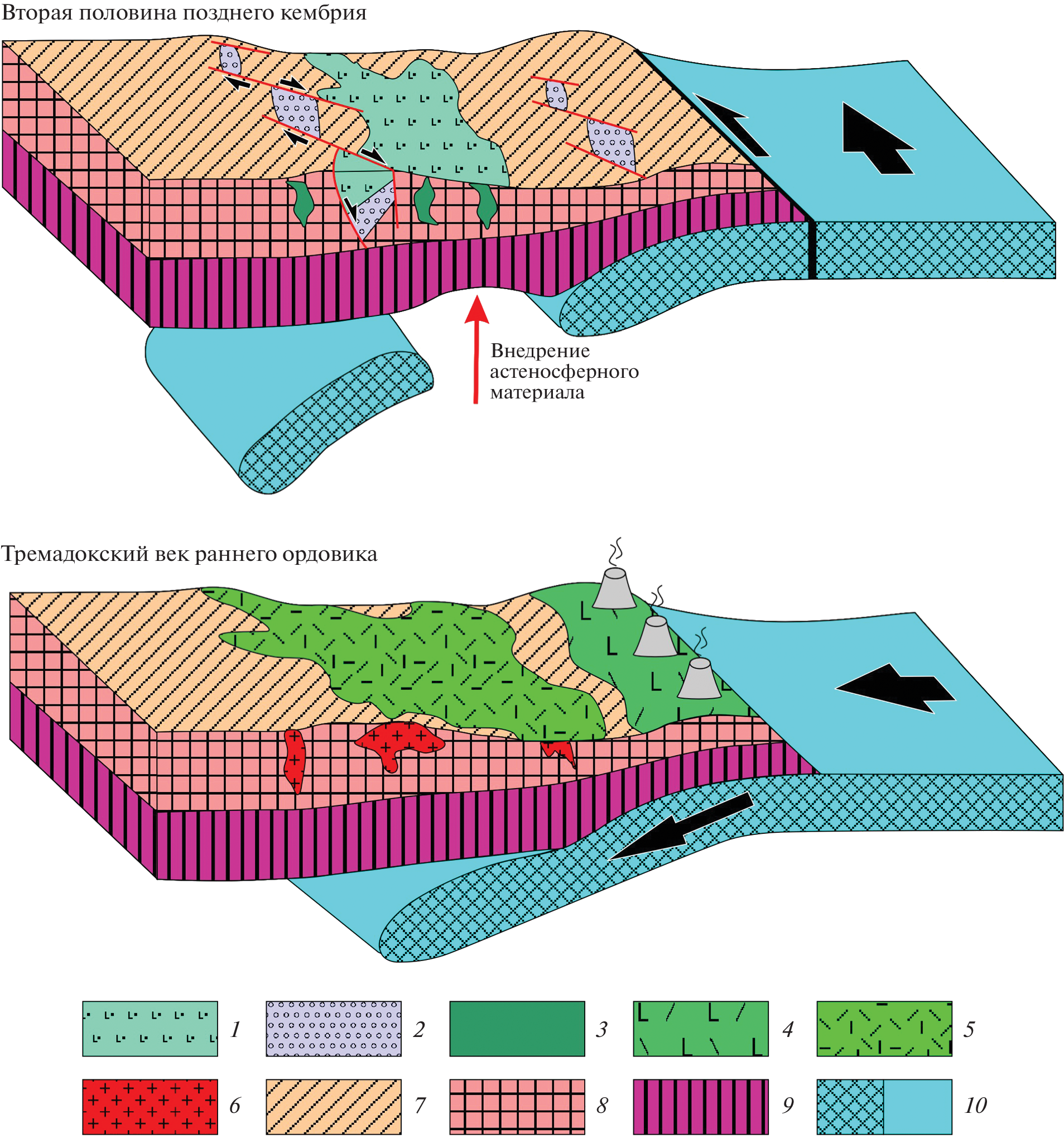 A comprehensive study of the Upper Cambrian and Lower Ordovician complexes of Northern Kazakhstan was carried out, their ages were substantiated, the structures and compositions of the rocks were investigated. It has been ascertained that the Upper Cambrian formations comprise coarse clastic strata, mafic alkaline effusive rocks and gabbro, while felsic volcanic rocks and granites are represented only by boulders in conglomerates. The Lower Ordovician rocks contain basalt-rhyolite series, felsic alkaline volcanic rocks, and granitoids. The lateral rows of structures of the active continental margin have been reconstructed for the Late Cambrian and Early Ordovician. In the Late Cambrian, the lateral series includes only the structures of the rear extension region, where complexes with the within-plate geochemical characteristics were formed. In the lateral series of the Early Ordovician structures, the frontal volcanic area with the island-arc volcanic rocks and the rear extension area with the intraplate felsic volcanic rocks and granites, were revealed. It is assumed that the differences in the lateral rows of structures may be associated with a change in the tectonic mode of the active continental margin at the Cambrian–Ordovician boundary, when the transform mode with no evidence of suprasubduction magmatism was replaced by convergent magmatism accompanied by the wide distribution of island-arc volcanic rocks.