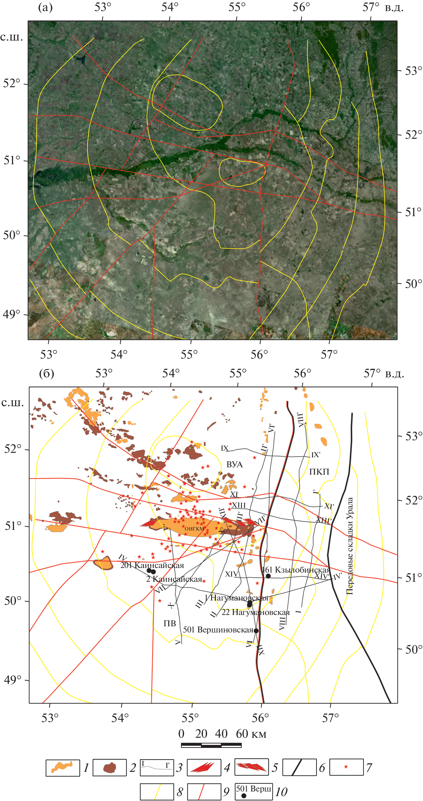 Проведено исследование глубинного строения Оренбургской радиально-концентрической структуры в фундаменте Русской платформы по сейсмотектоническим и геоморфологическим данным. Для этого выполнена интерпретация временны́х региональных сейсмических профилей, пересекающих структуру, с выделением главных глубинных разломов и замером углов падения. Выявлено, что радиально-концентрическая структура представляет собой крупную цветковую структуру. В ее строении участвуют основные разнонаправленные глубинные нарушения, падающие под углами \(\perp \)60°–85° и ограничивающие в фундаменте зоны горстов или взбросов. Установлено иерархическое строение разломов структуры. Месторождения нефти и газа приурочены к основным глубинным дислокациям Оренбургской структуры и представляют собой морфологические цветковые структуры малых размеров. Выполнено экспериментальное моделирование формирования цветковых структур с использованием данных акустической эмиссионной активности пород и под действием флюидодинамических нагрузок, произведенных на установке УИК-АЭ (ИГ УрО РАН, Россия) на образцах керна песчаников из пород-коллекторов нефтяных месторождений Западной Сибири. Разработанная модель показала, что образование цветковых структур может происходить без горизонтального сдвига за счет бокового сжатия и глубинного давления. С помощью метода сейсмоакустической эмиссии были зафиксированы характерный шум при образовании трещин в образцах керна, затихание звука перед раскалыванием и затем его резкое взрывное увеличение от разрыва сплошности породы. Анализ керна скважин, пробуренных в пределах Оренбургской радиально-концентрической структуры, выявил, что в породах осадочного чехла имеется достаточно много признаков гидротермальных флюидных разгрузок, таких как волнистая (или плойчатая) слоистость, своеобразные текстуры и интервалы брекчий, cкорлуповидная форма включений, стиллотитовые швы, флюидальные текстуры. Сделан вывод о том, что генезис Оренбургской радиально-концентрической структуры связан с воздействием глубинных потоков тепла, флюидов, высокого давления и имеет общность со взрывными кольцевыми структурами щитов и платформ.