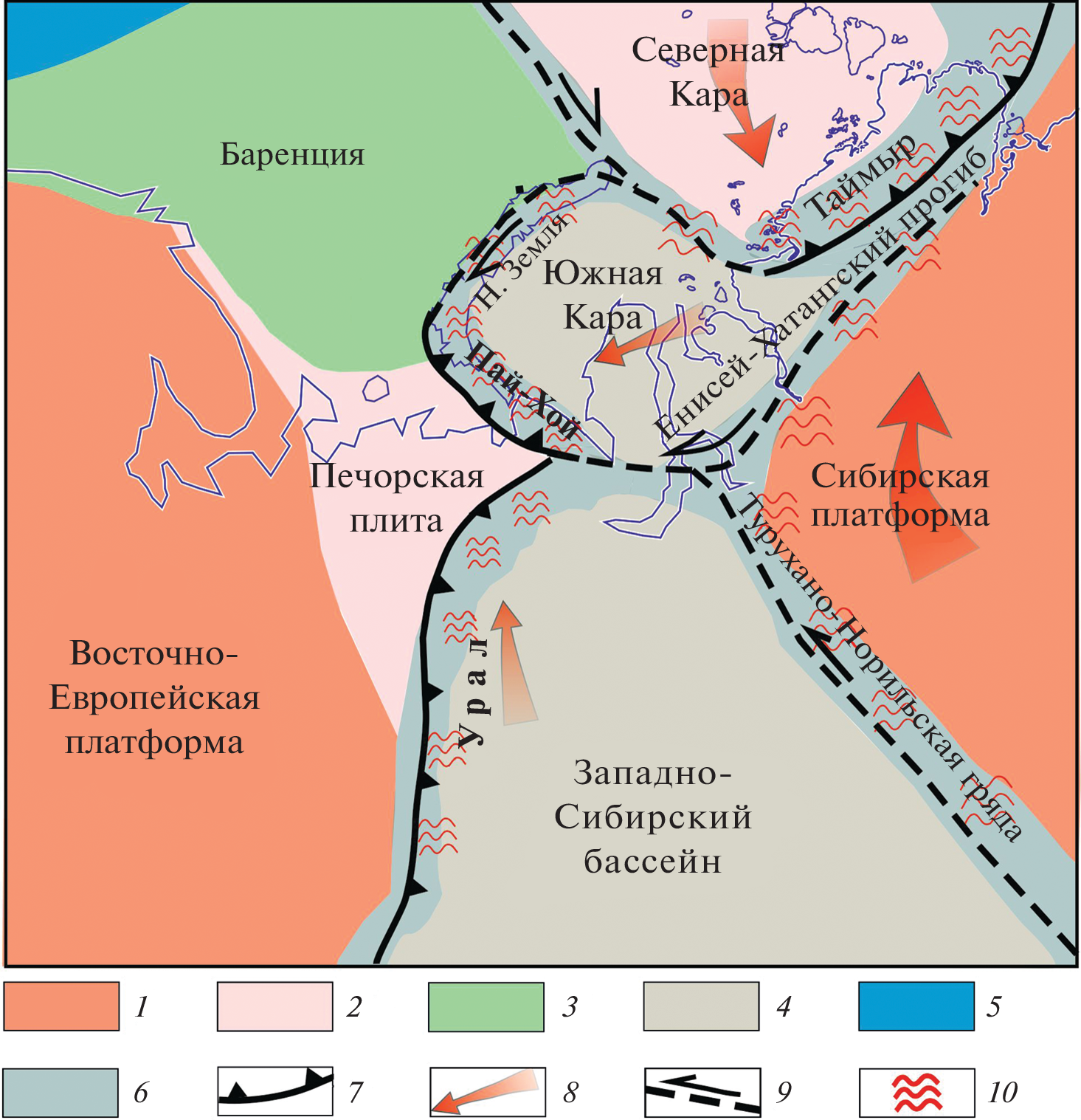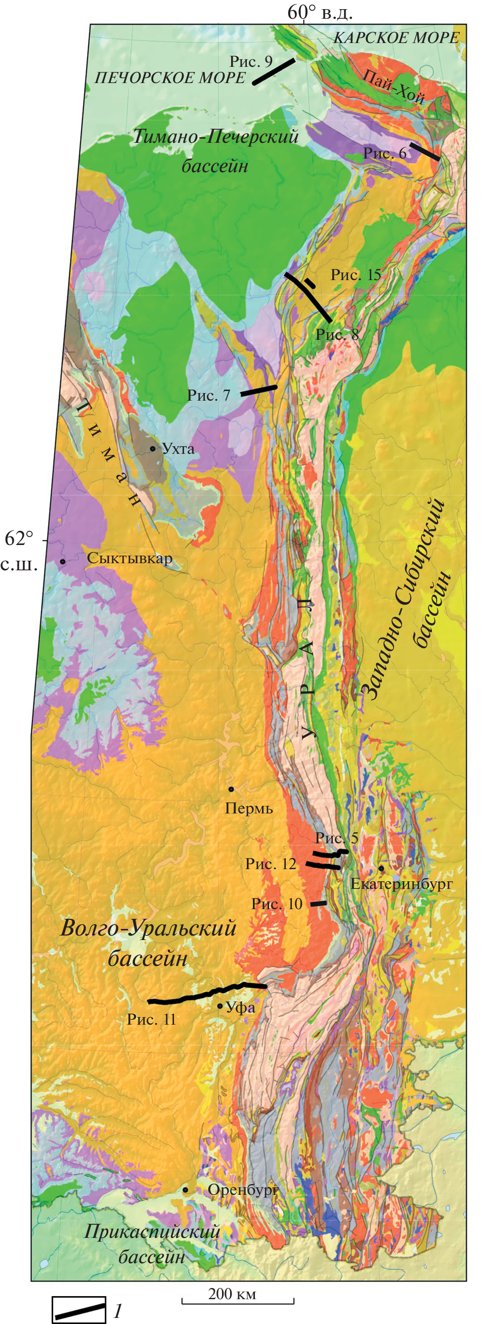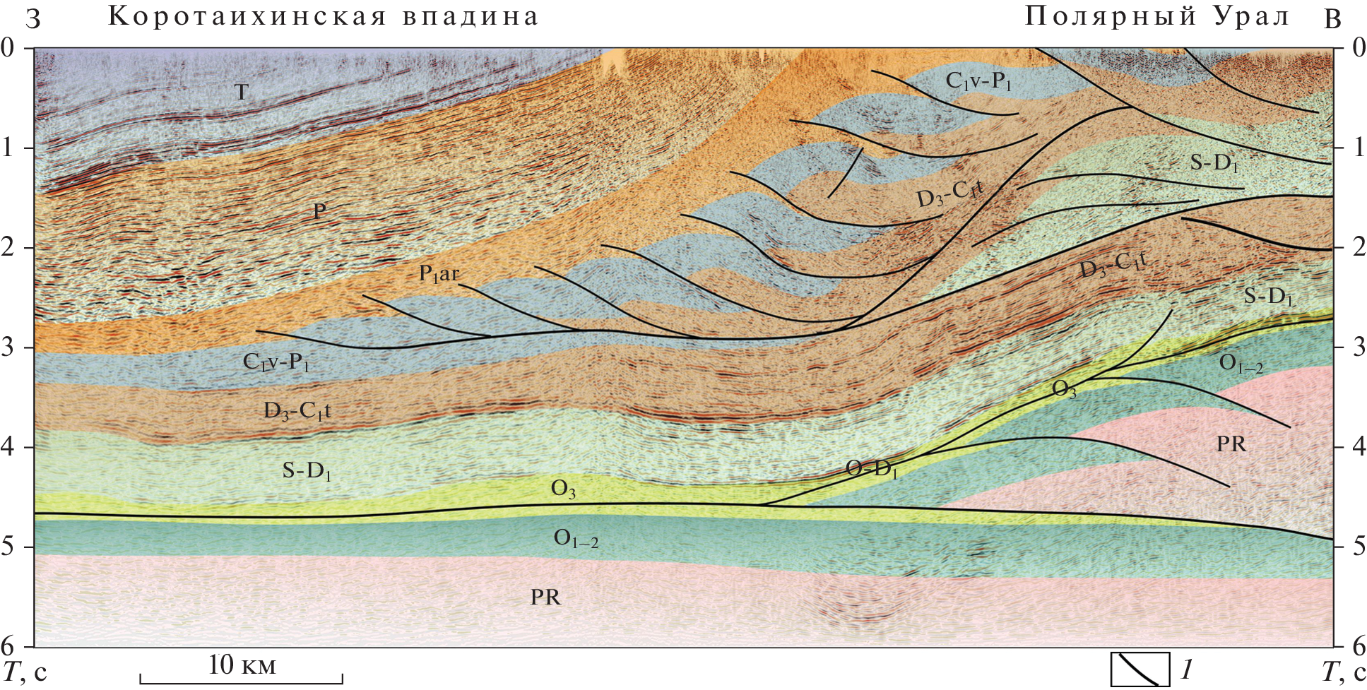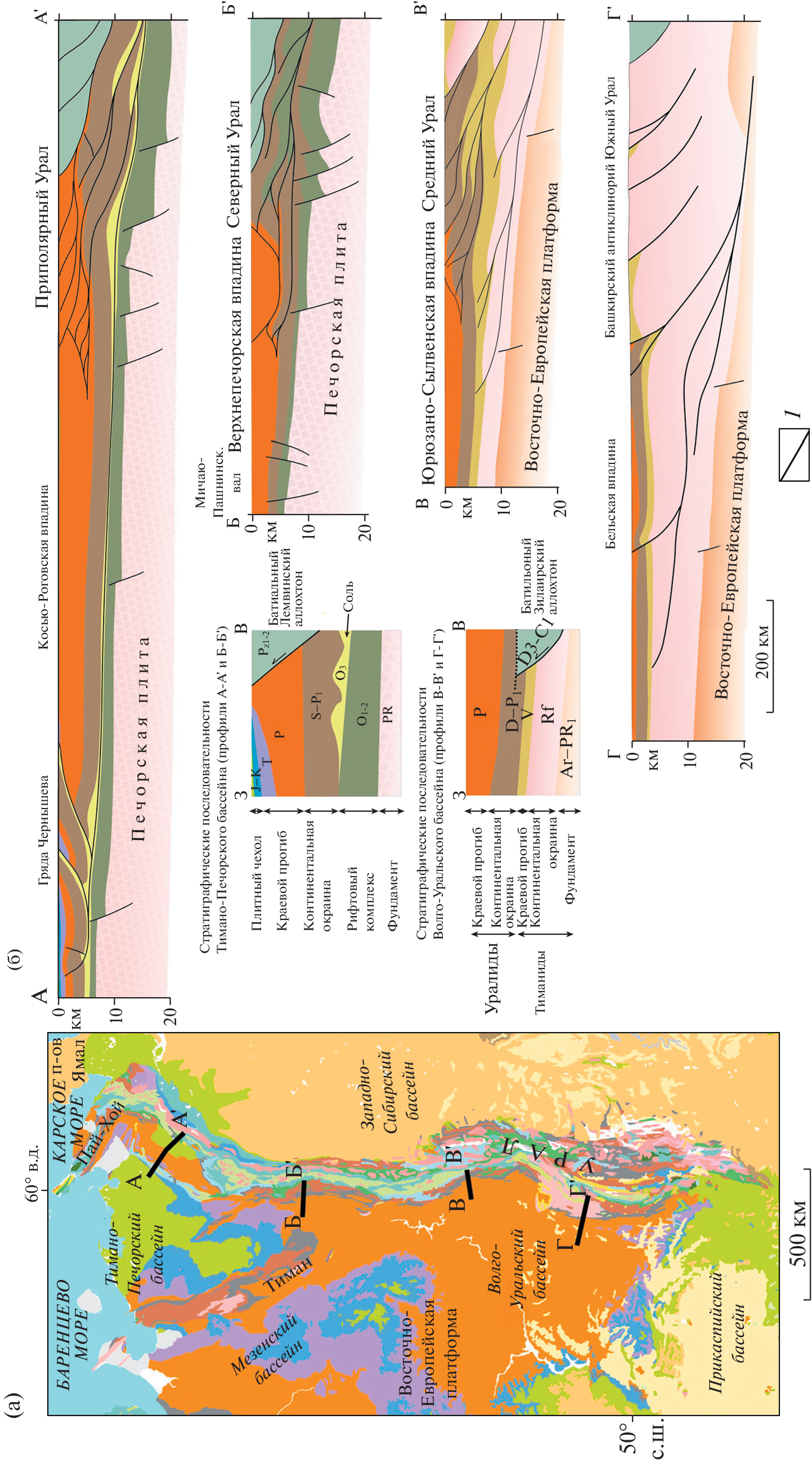 В статье приведена интерпретация геофизических данных, характеризующих строение зоны предгорной складчатости Урала и Пай-Хоя, которая показывает многообразие структурных стилей деформаций региона исследования. Рассмотрены следующие структурные стили деформаций ‒ надвиговые зоны классического стиля, представляющие собой чешуйчатые системы надвиговых пластин, последовательно перекрывающие друг друга и прилегающую часть краевого прогиба (i); области распространения клиновидных аллохтонов, сложенные дуплексными тектоническими пластинами, не имеющими отражения в приповерхностных слоях (ii); зоны инверсии, где сбросы связанные с уральским рифтингом, трансформированы в надвиги (iii); районы, строение которых определяется деформациями соляных диапиров и экструзией соли (iv); зоны, тектонического утолщения докембрийских комплексов, перекрытых палеозойским чехлом (v). Интерпретация исторических и новых данных о строении складчатых поясов позволяет существенно уточнить представления о строении и развитии районов таких, как зоны клиновидных вдвигов, области развития дислоцированных соляных диапиров и районы, где происходили реактивация и тектоническое утолщение докембрийских комплексов за счет реактивации разломов древнего заложения. Новые сейсмические данные позволяют уточнить амплитуду складчато-надвиговых дислокаций и время фаз деформаций. Они впервые показали наличие зон развития эмбриональных надвигов.