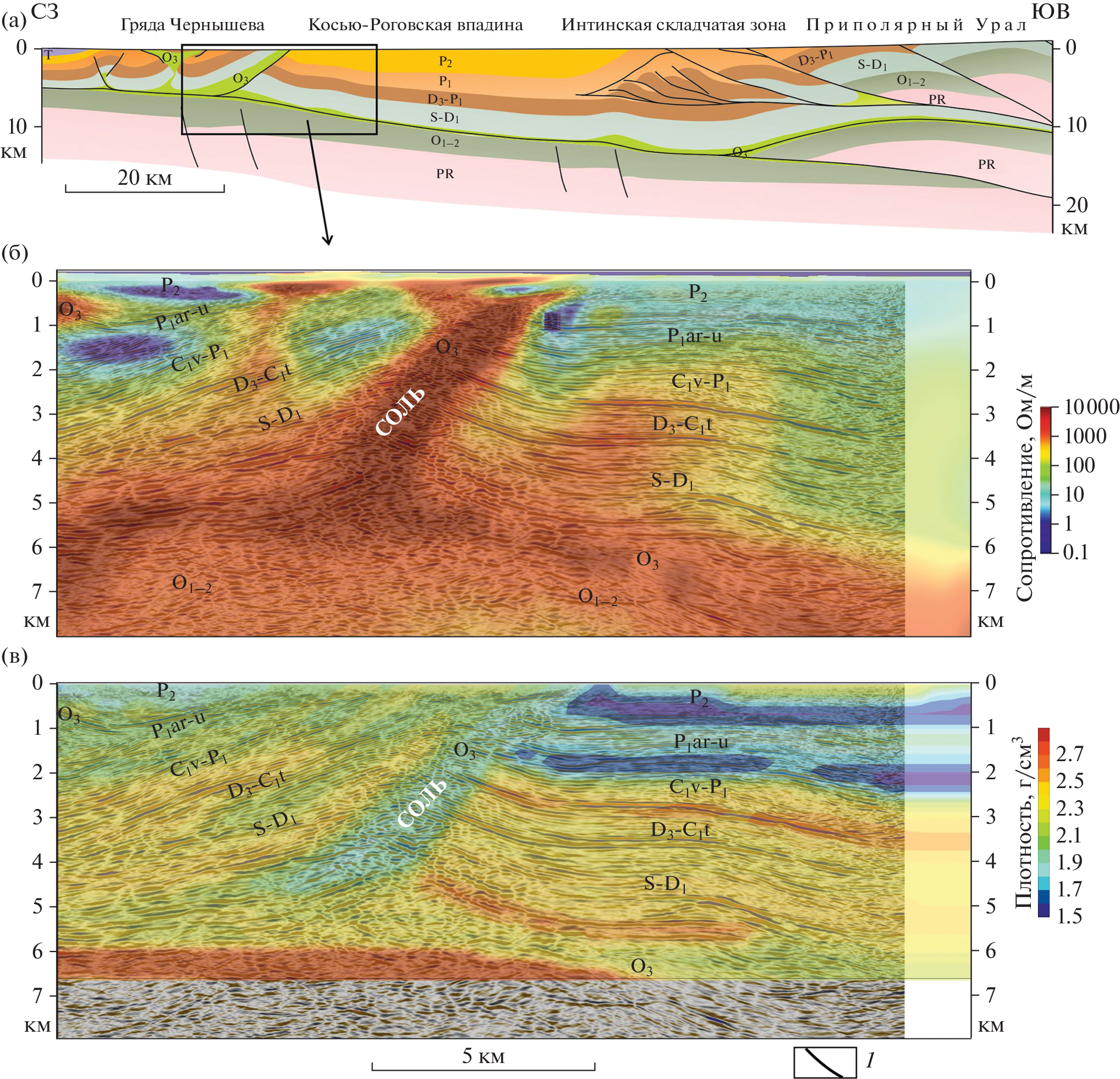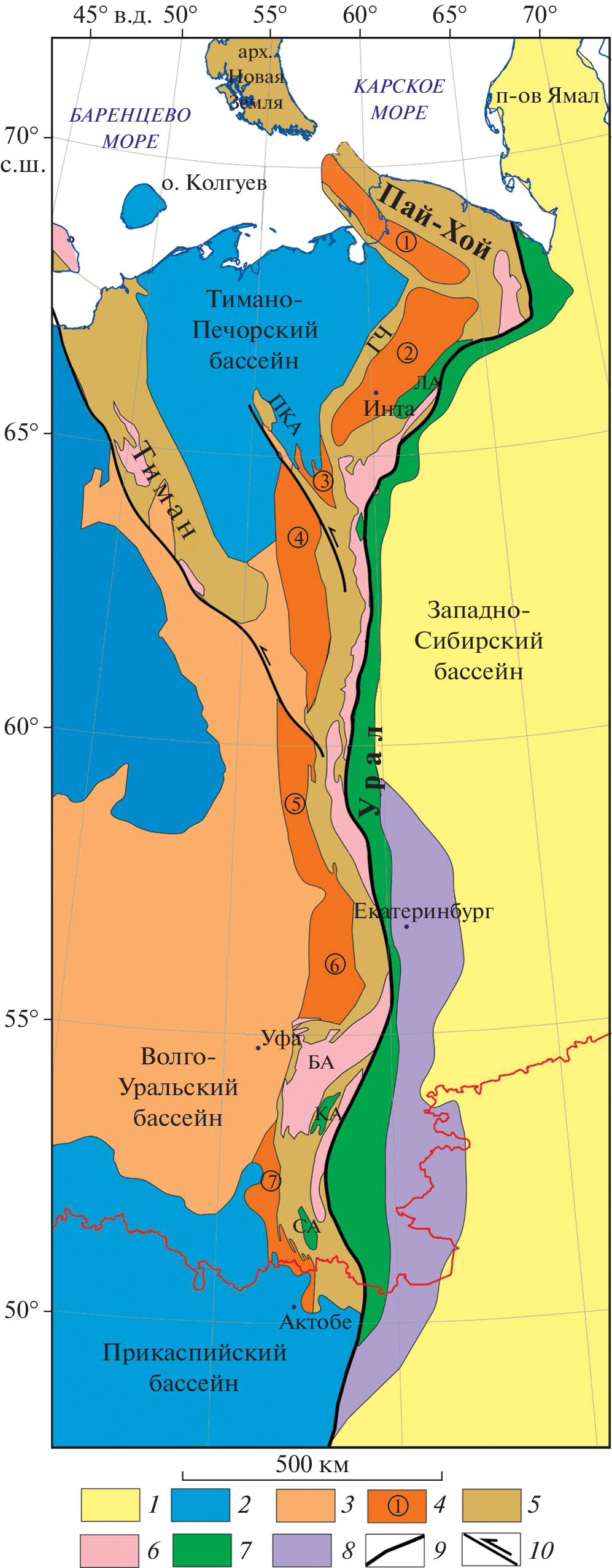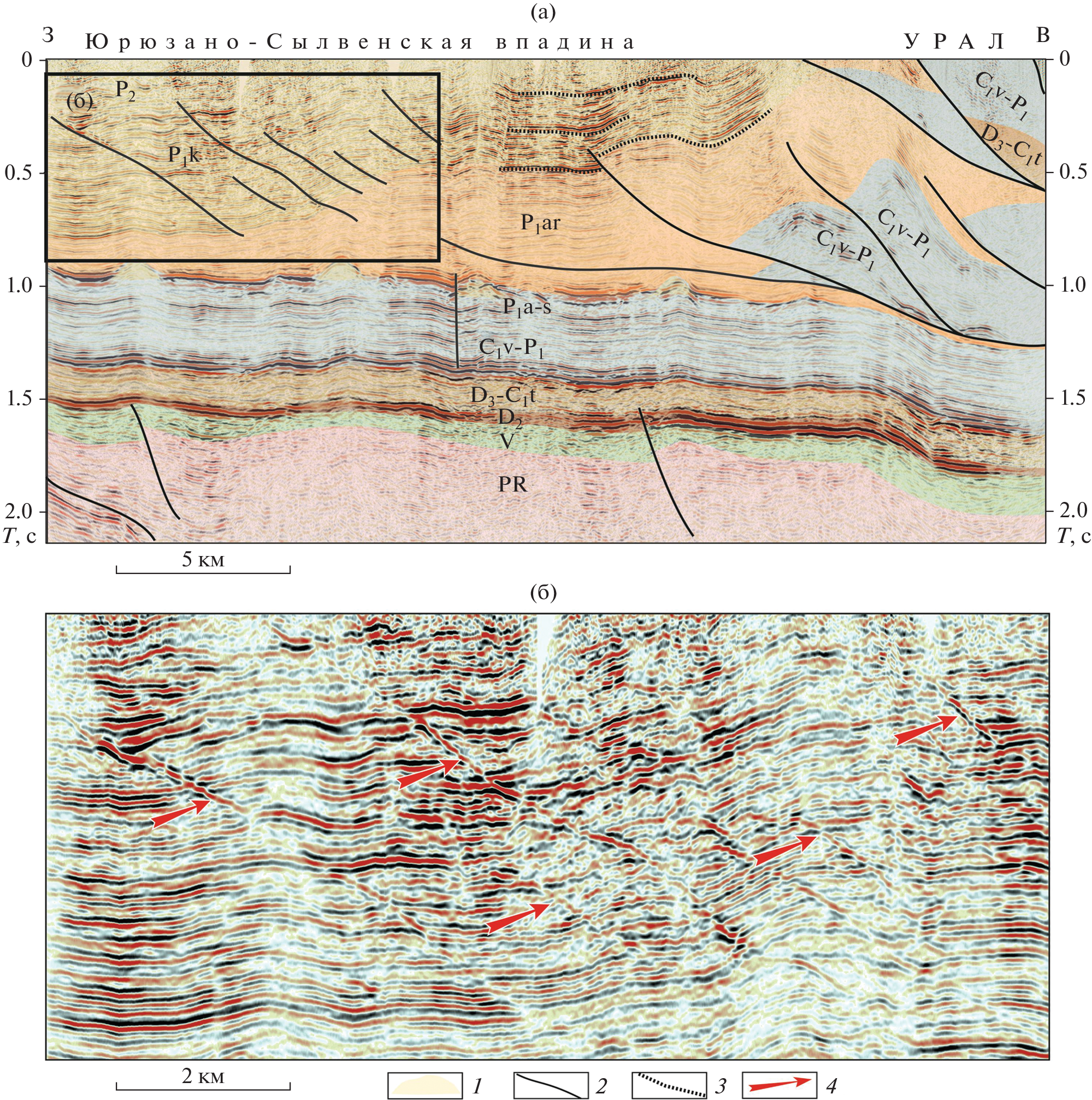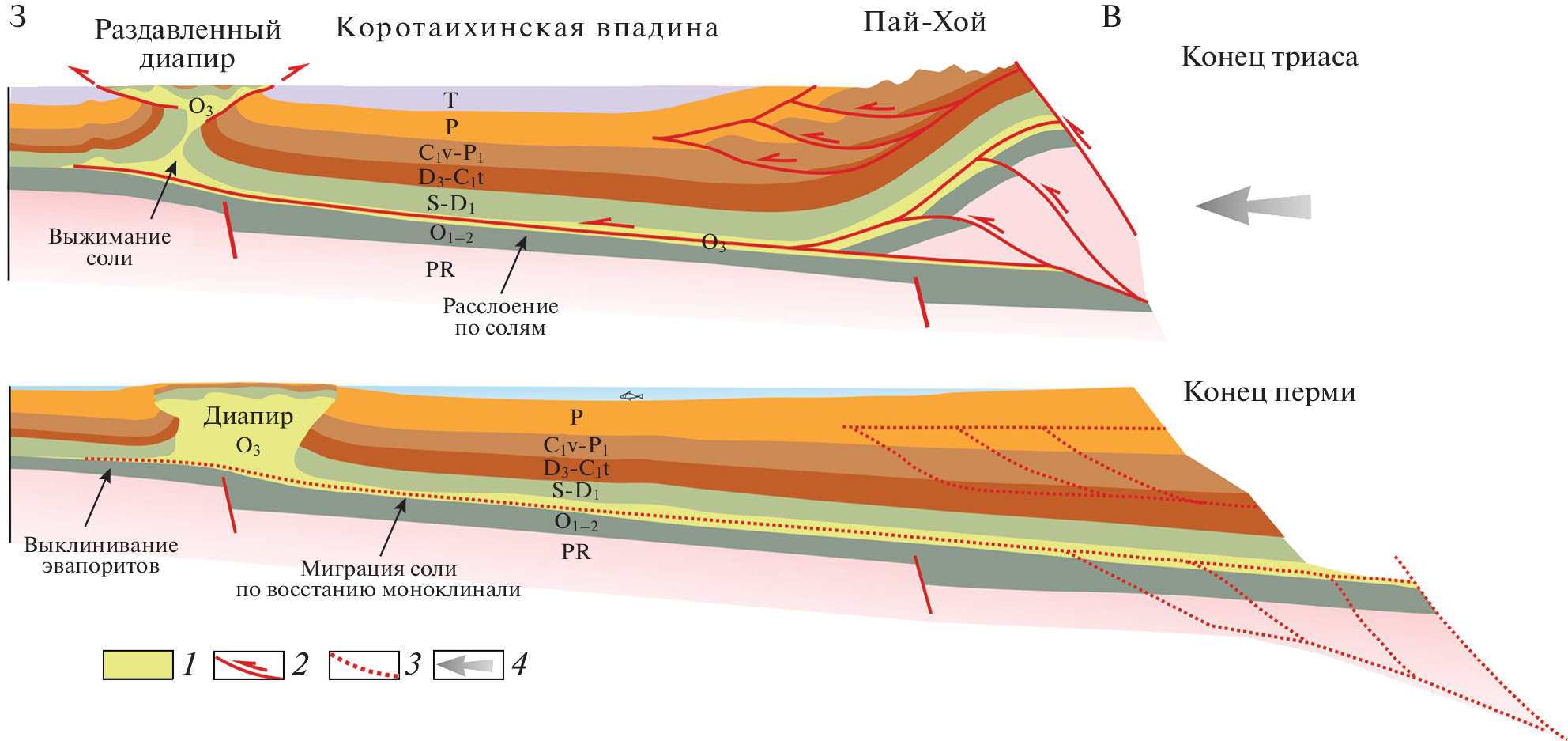В статье приведена интерпретация геофизических данных, характеризующих строение зоны предгорной складчатости Урала и Пай-Хоя, которая показывает многообразие структурных стилей деформаций региона исследования. Рассмотрены следующие структурные стили деформаций ‒ надвиговые зоны классического стиля, представляющие собой чешуйчатые системы надвиговых пластин, последовательно перекрывающие друг друга и прилегающую часть краевого прогиба (i); области распространения клиновидных аллохтонов, сложенные дуплексными тектоническими пластинами, не имеющими отражения в приповерхностных слоях (ii); зоны инверсии, где сбросы связанные с уральским рифтингом, трансформированы в надвиги (iii); районы, строение которых определяется деформациями соляных диапиров и экструзией соли (iv); зоны, тектонического утолщения докембрийских комплексов, перекрытых палеозойским чехлом (v). Интерпретация исторических и новых данных о строении складчатых поясов позволяет существенно уточнить представления о строении и развитии районов таких, как зоны клиновидных вдвигов, области развития дислоцированных соляных диапиров и районы, где происходили реактивация и тектоническое утолщение докембрийских комплексов за счет реактивации разломов древнего заложения. Новые сейсмические данные позволяют уточнить амплитуду складчато-надвиговых дислокаций и время фаз деформаций. Они впервые показали наличие зон развития эмбриональных надвигов.