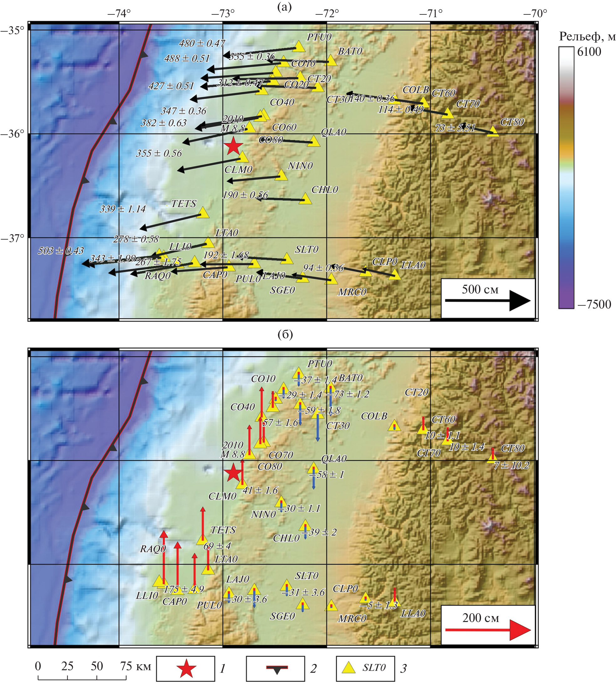 - Vigny C., Socquet A., Peyrat S., Ruegg J.-S., Métois M., Madariaga R., Morvan S., Lancieri M., Lacassin R., Campos J., Carrizo D., Bejar-Pizarro M., Barrientos S., Armijo R., Aranda C., Valderas-Bermejo M.-C., Ortega I., Bondoux F., Baize S., Lyon-Caen H., Pavez A., Vilotte J.P., Bevis M., Brooks B., Smalley R., Parra H., Baez J.-C., Blanco M., Cimbaro S., Kendrick E. The 2010 Mw 8.8 Maule Megathrust Earthquake of Central Chile, Monitored by GPS // Science. 2011. Vol. 332. No. 6036. P. 1417–1421. https://doi.org/10.1126/science.1204132