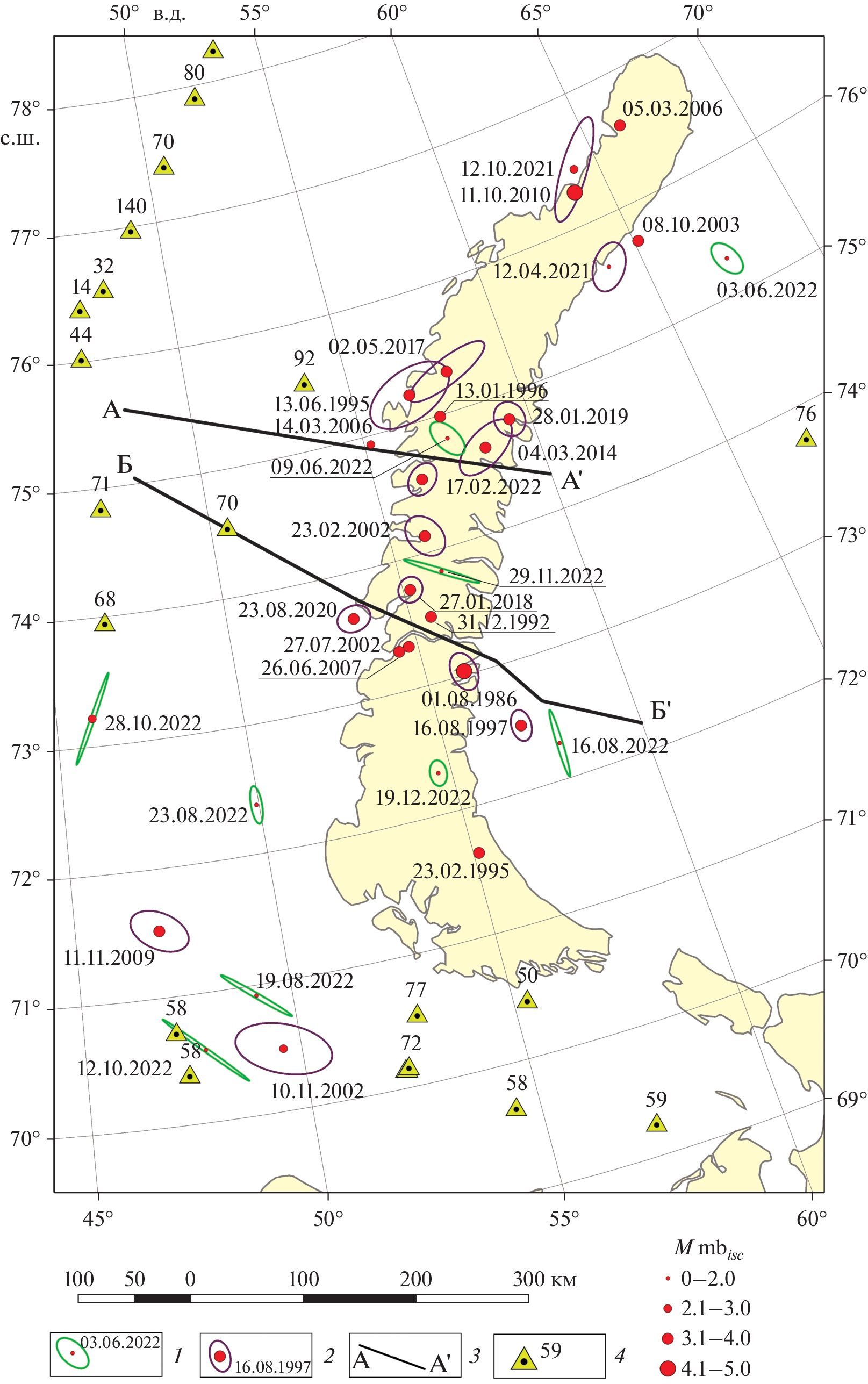 - Morozov A.N., Asming V.E., Vaganova N.V., Konechnaya Ya.V., Mikhaylova Ya.A., Evtyugina Z.A. Seismicity of the Novaya Zemlya archipelago: Relocated event catalog from 1974 to 2014 // J. Seismol. 2017. Vol. 21. № 6. P. 1439–1466. https://doi.org/10.1007/s10950-017-9676-y