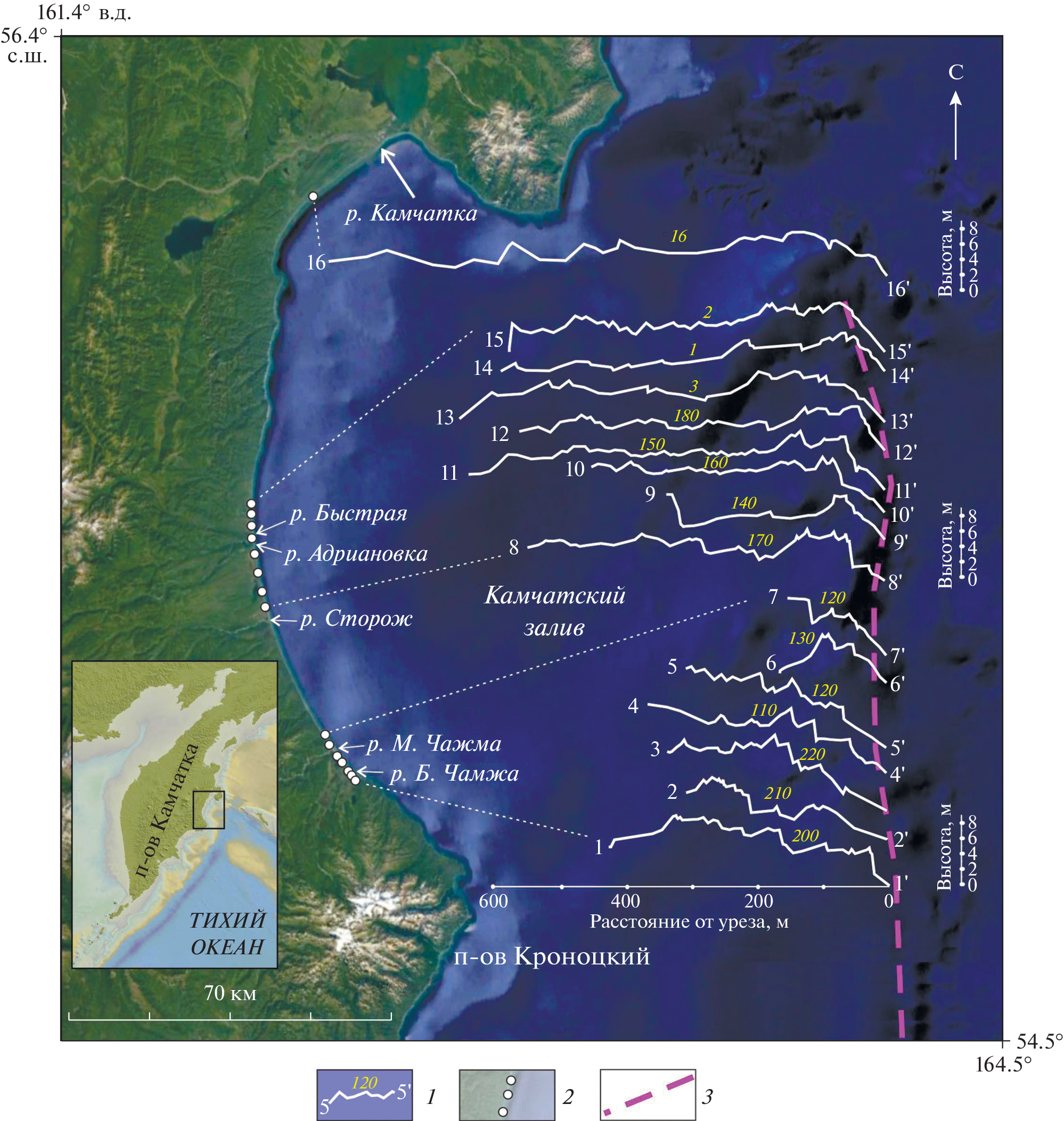 - Pinegina T.K., Bourgeous J., Bazanova L.I., Zelenin E.A., Krasheninnikov S.P., Portnyagin M.V. Coseismic coastal subsidence associated with unusually wide rupture of prehistoric earthquakes on the Kamchatka subduction zone: A record in buried erosional scarps and tsunami deposits // Quaternary Sci. Rev. 2020. Vol. 233. L. 106171.