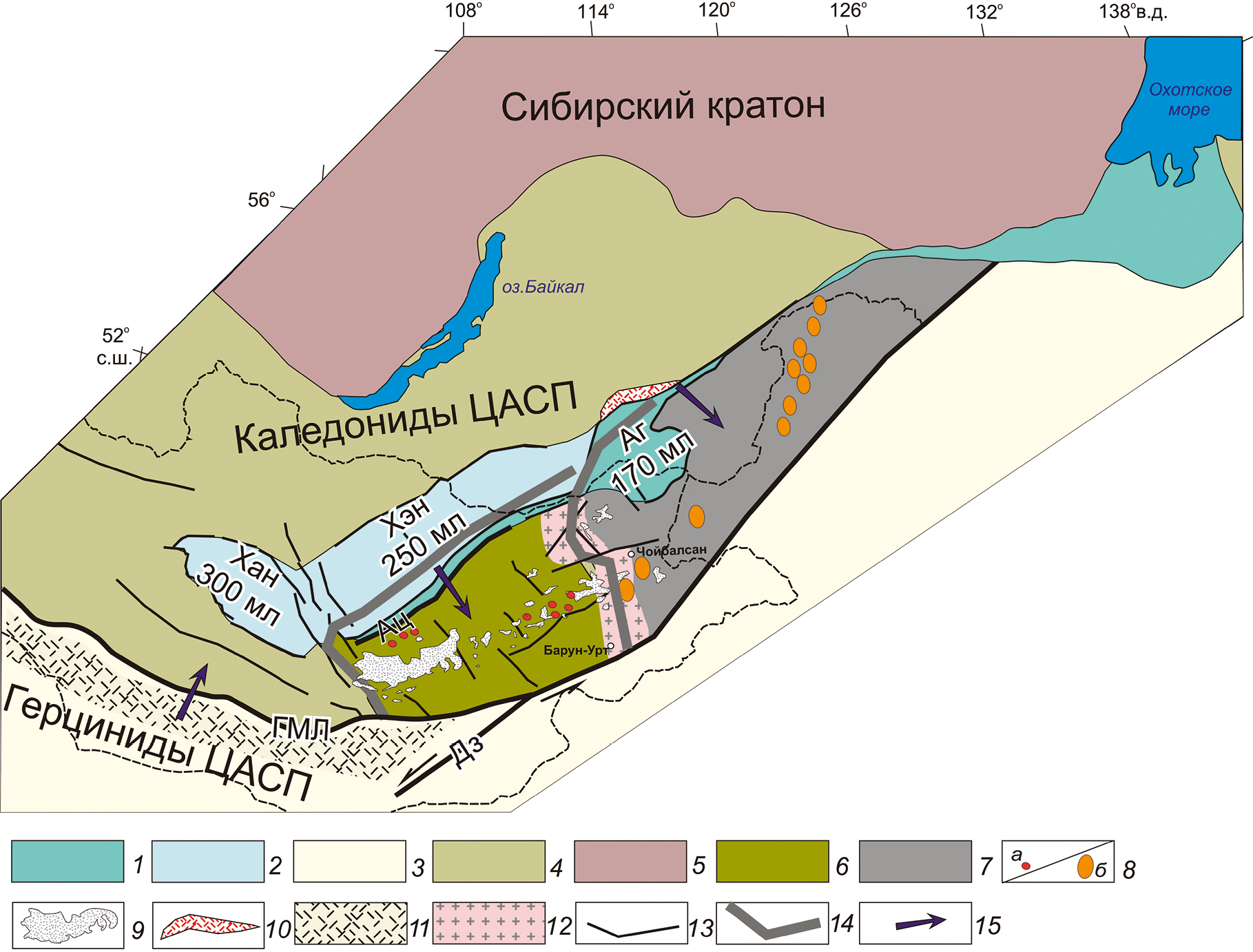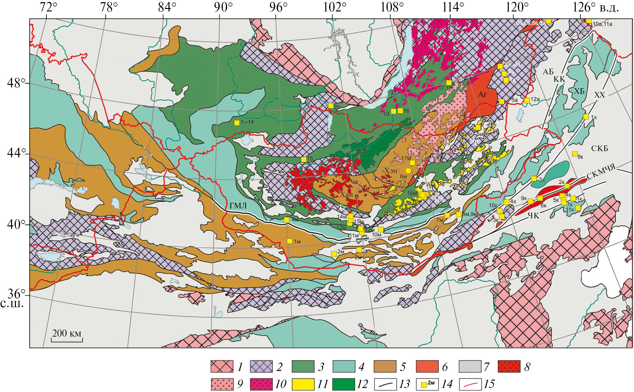 1 — фундамент древних кратонов; 2 — микроконтиненты с довендским фундаментом; 3‒7 — складчатые области: 3 — венд‒раннепалеозойские (ранние каледониды), 4 — ранне-среднепалеозойские (поздние каледониды), 5 — средне-позднепалеозойские (герциниды), 6 — позднепалеозойские‒раннемезозойские (индосиниды), 7 — PZ–MZ‒CZ — осадочный и вулканогенный платформенный чехол; 8‒10 — гранитные батолиты: 8 — Хангайский, 9 — Хентейский, 10 — Ангаро-Витимский; 11‒12 — вулканический пояс: 11 — Северогобийский, 12 — Селенгинский; 13 — сутуры; 14 — район проведения палеомагнитных исследований; 15 — государственная граница