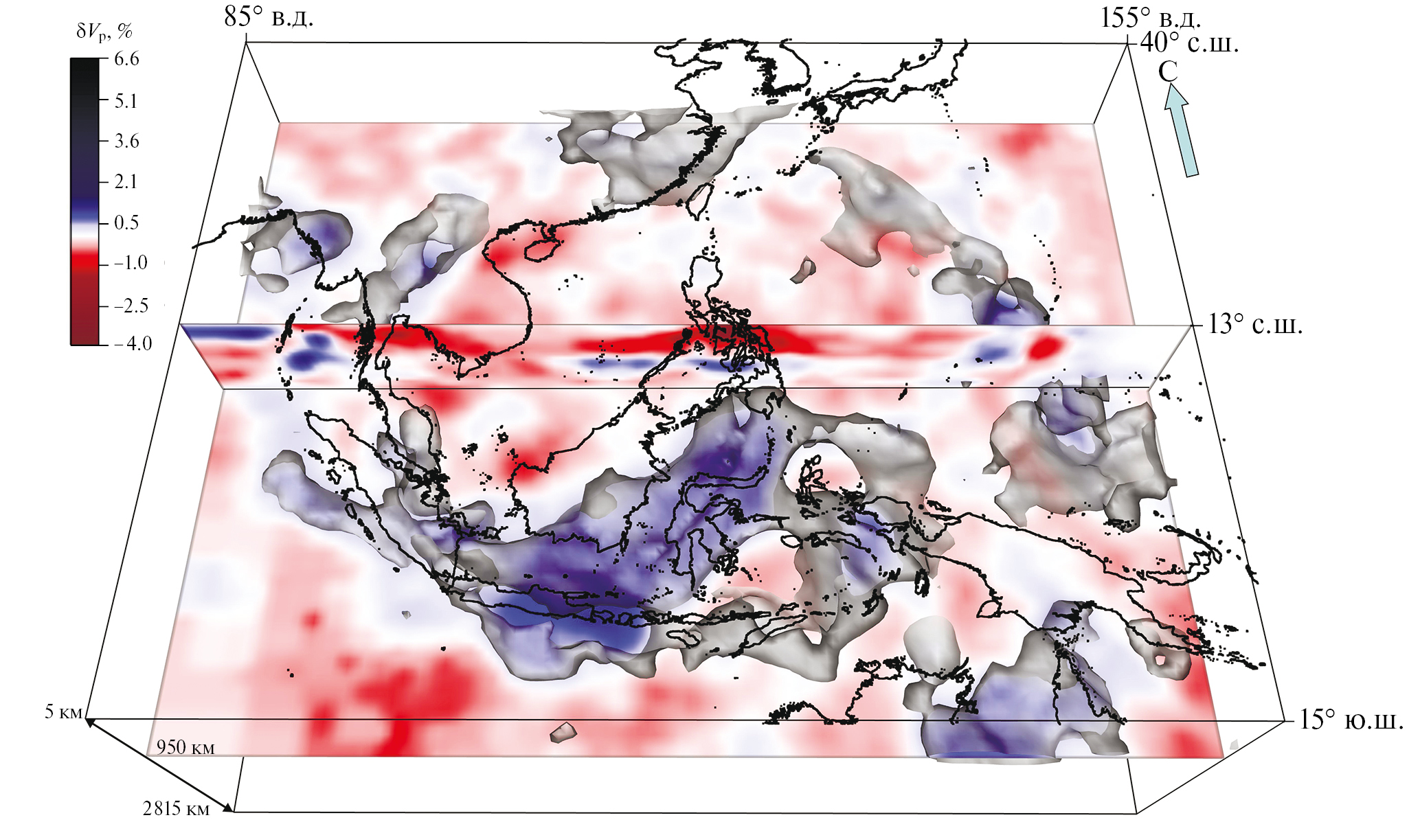 Рис. 4. Объемное распределение вариаций скоростей δVp в Юго-Восточной Азии по данным модели UU-P07 [17, 26, 36].