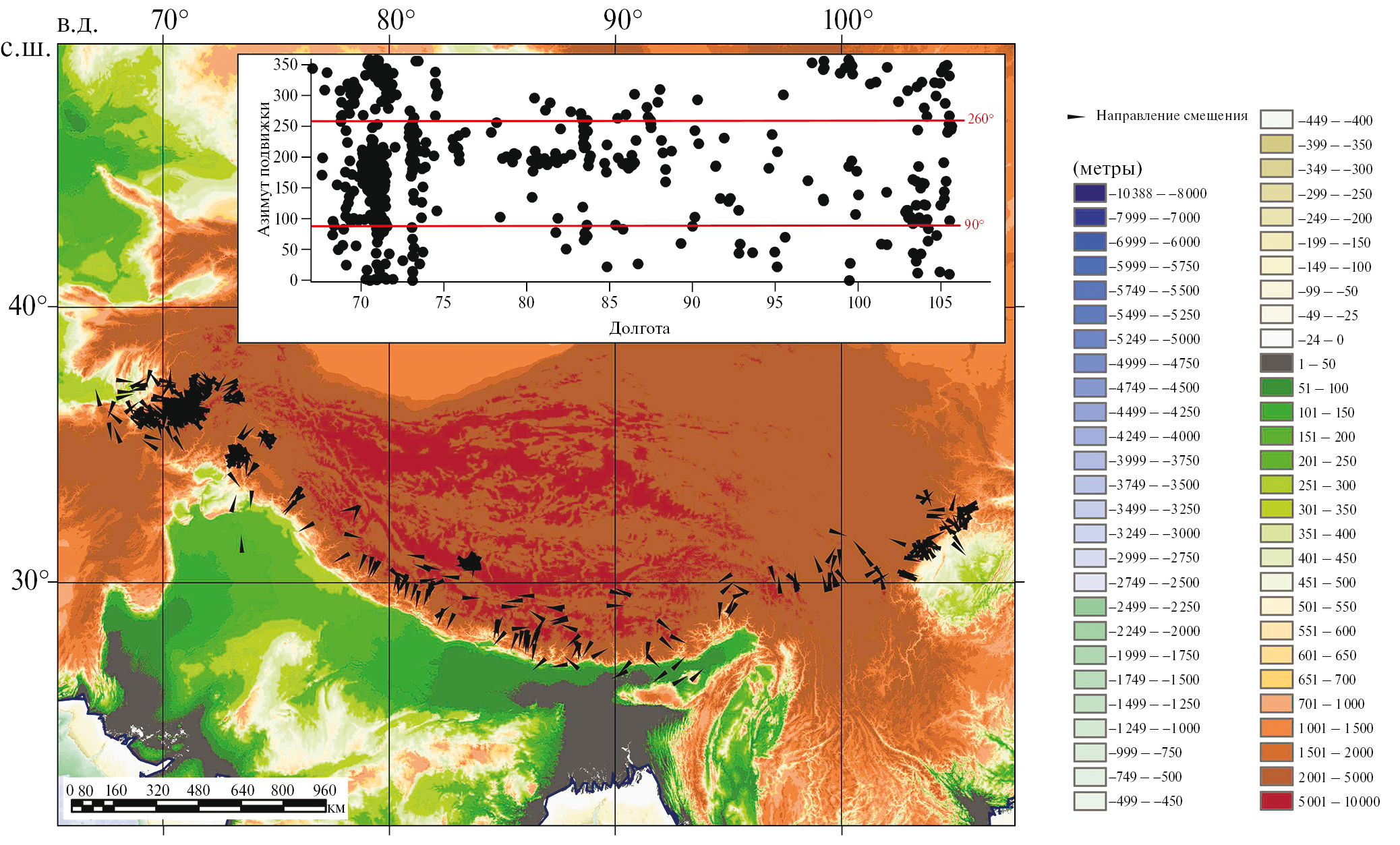 Гималайская дуга является современной коллизионной границей Индостана и Евразийской плиты. Поле векторов GPS в районе дуги имеет веерообразный разворот от ~355o на западе дуги до ~30o на востоке с общей северной направленностью движения приповерхностных блоков [27, 22] (см. рис. 9).