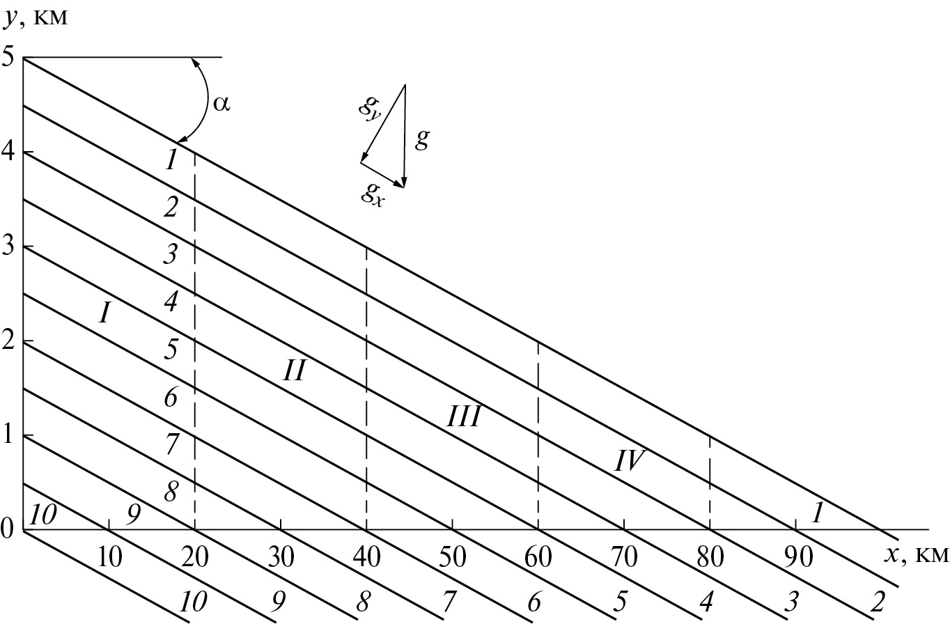 Проанализируем геодинамические процессы в склоне поднятия, сформированного плюмом, рассматривая в качестве модели склона поднятия слой вязкой ньютоновской жидкости с наклонной верхней границей. Представлена схема поднятия в плос- кости, нормальной к оси главного хребта (рис. 1).
