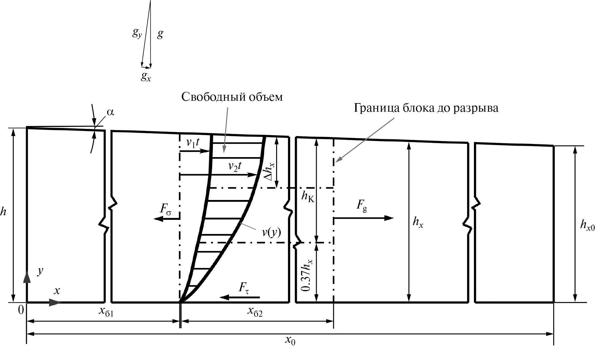 Обозначено: xб1 и xб2 – длина блоков; v1t и v2t – размеры свободного объема между блоками, образующегося за время t