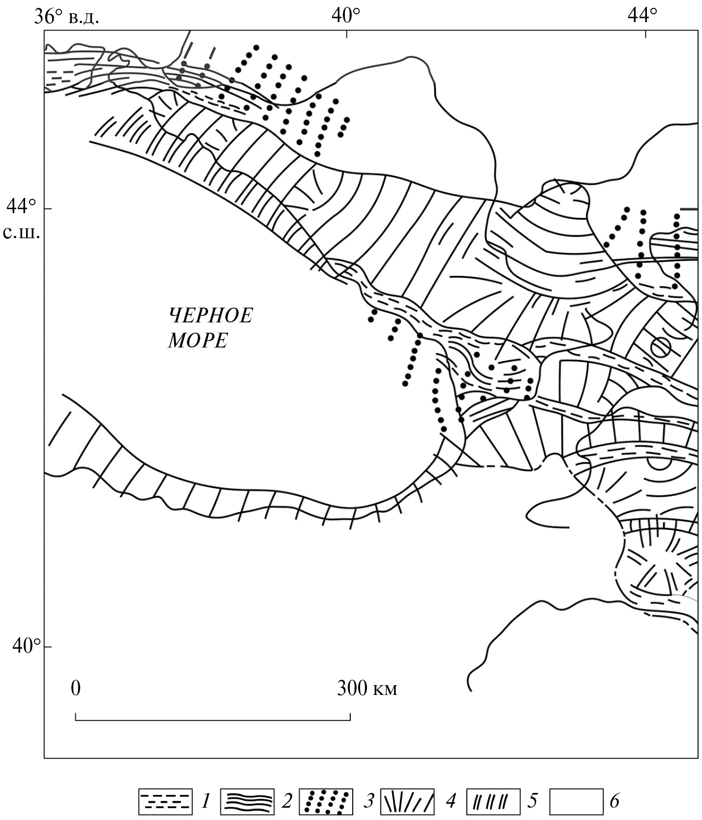 1‒2 – зоны сжатия в позднеорогенной стадии: 1 ‒ первая фаза, 2 – вторая и третья фазы; 3‒5 – зоны растяжения в позднеорогенной стадии (показана ориентация осей растягивающих напряжений): 3 ‒ первая фаза, 4 – вторая и третья фазы; 5 – зоны особенно сильного растяжения во второй и третьей фазах; 6 – зоны отсутствия (или слабые проявления) растяжения и сжатия