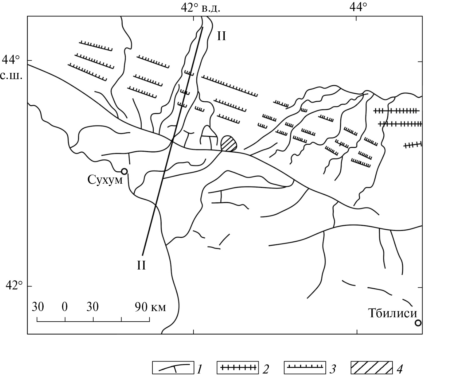 Рис. 9. Структура склона поднятия Кавказа в его северо-западном крыле в разрезе по линии II–II (по [23], с изменениями).