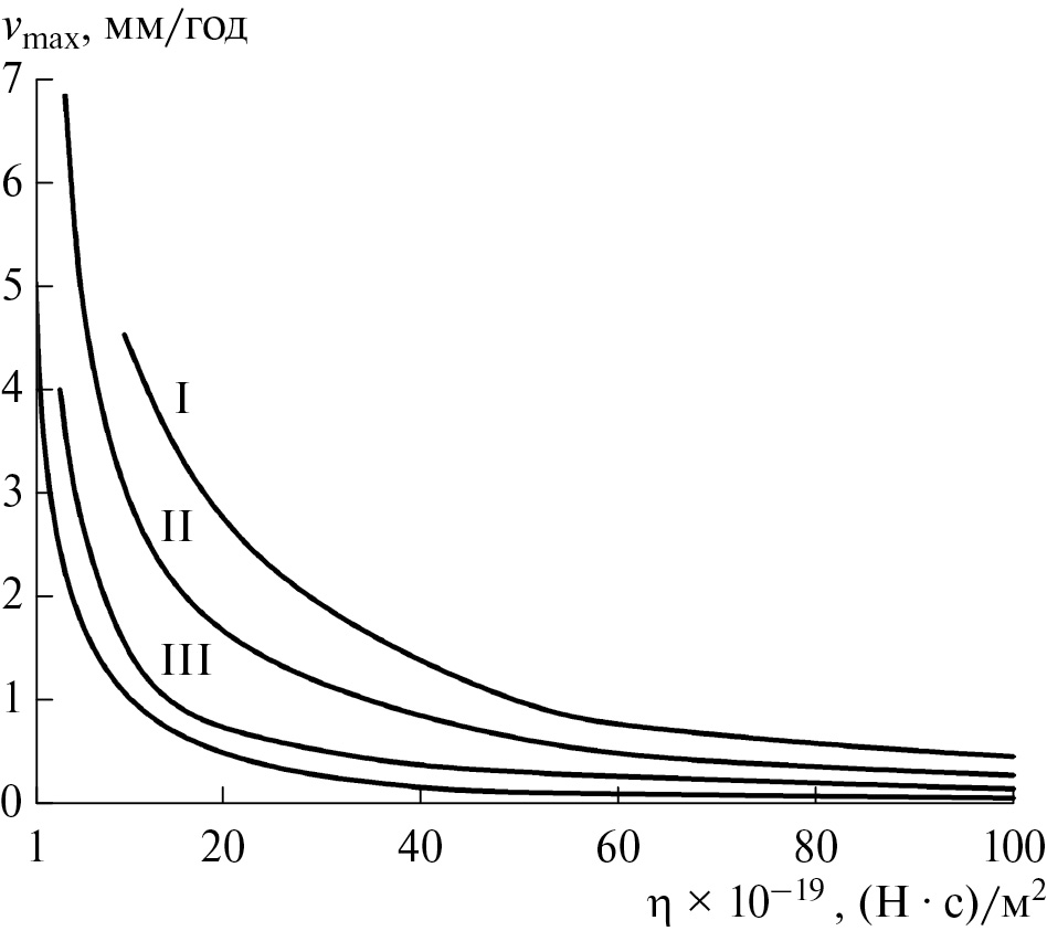 Как следует из равенства (15), вязкость склона должна уменьшаться от значения η0 на оси главного хребта (при = 0) до величины 0.04η0 при = 1 (x = x0), т.е. вязкость склона должна уменьшаться в 25 раз. В этом случае скорость vmax будет постоянной.