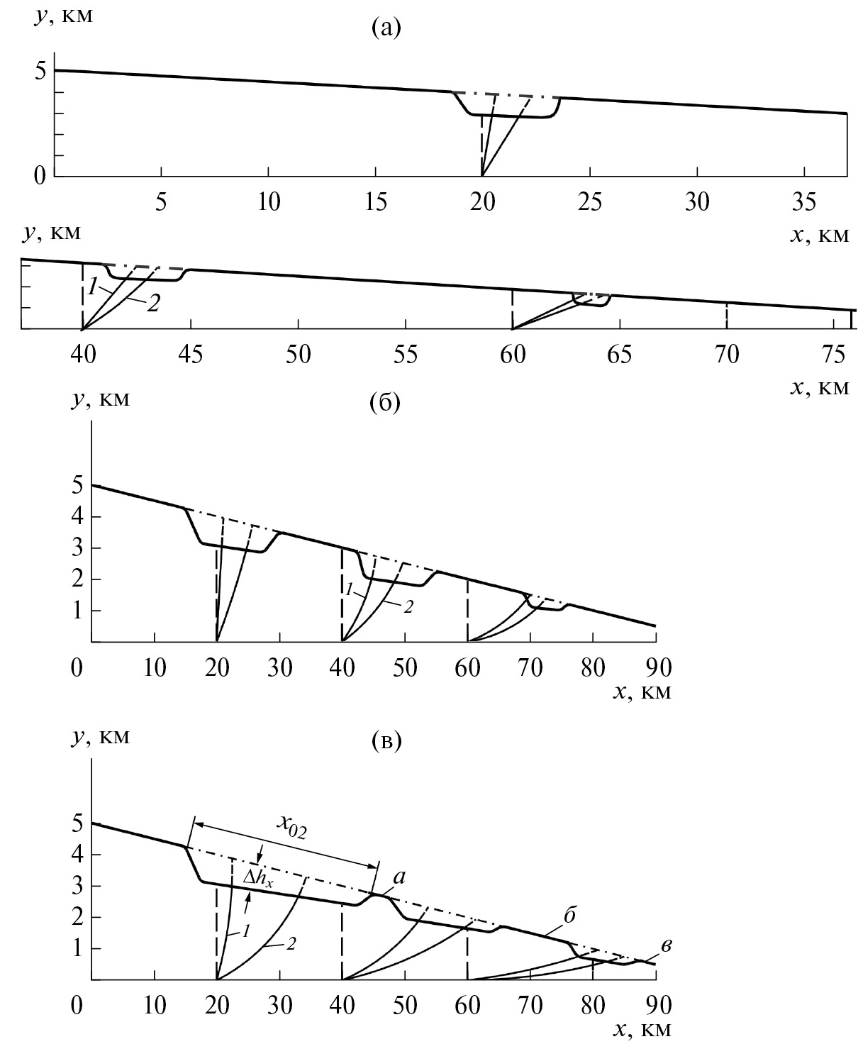 Таким образом, определялась протяженность x02 области опускания свободной поверхности склона (депрессии) (см. рис. 8).