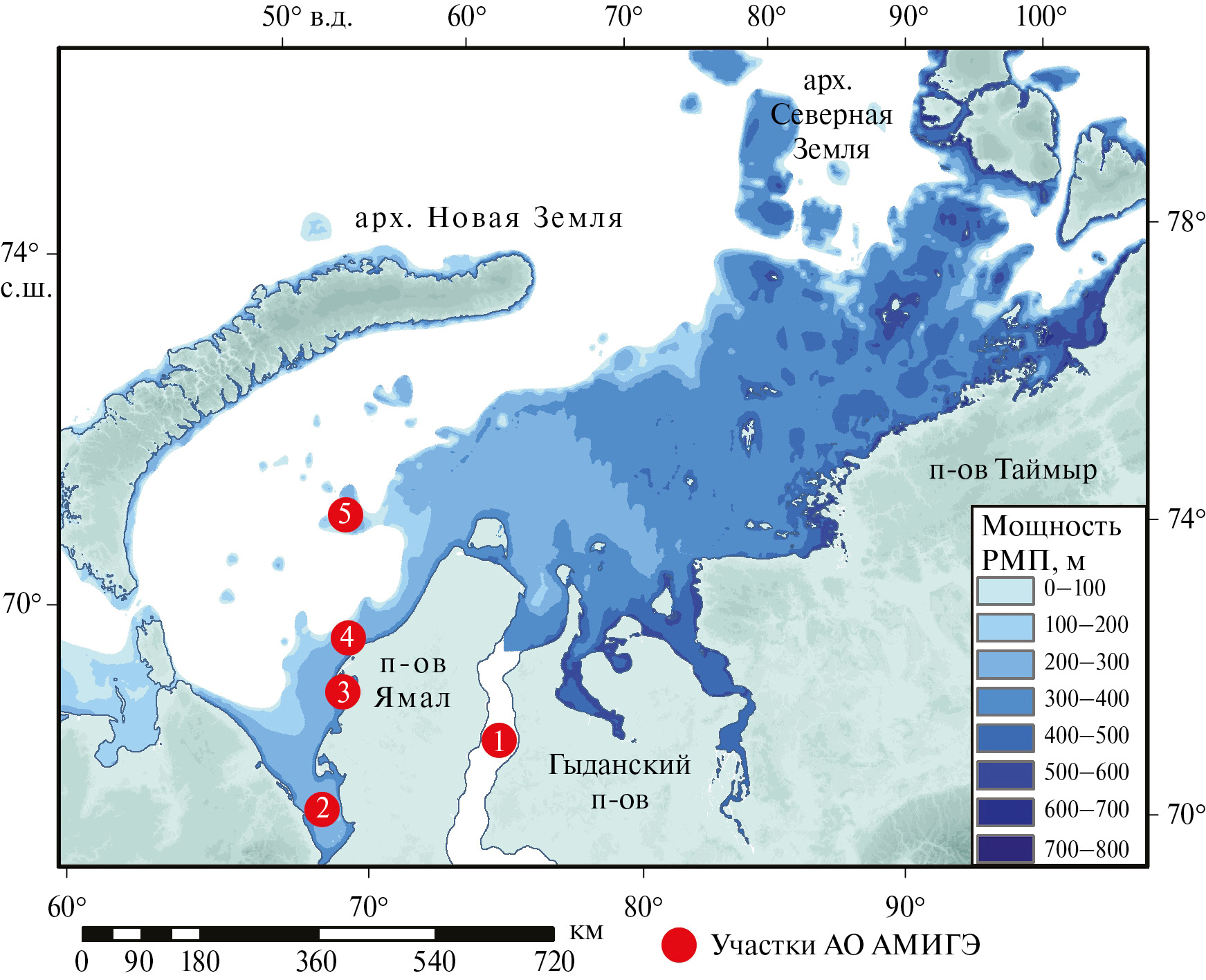 Сопоставление геотермических измерений из архива [46] с картой [33] позволили нам определить с учетом [34] среднюю величину теплового потока для Притаймырского шельфа Карского моря, равную 57.2 мВт/м2. Уплотнение отложений с глубиной учитывалось по закону Ати [37]. Теплофизические свойства отложений даны по [59]. Расчет проводился средствами открытого языка программирования “Julia” [68] по неявной разностной схеме для домена 10 тыс. м с шагом 1 м по расчетной сети и с шагом по времени 109 с. Картирование выполнялось для регулярной сети с разрешением 0.08о × 0.08о.