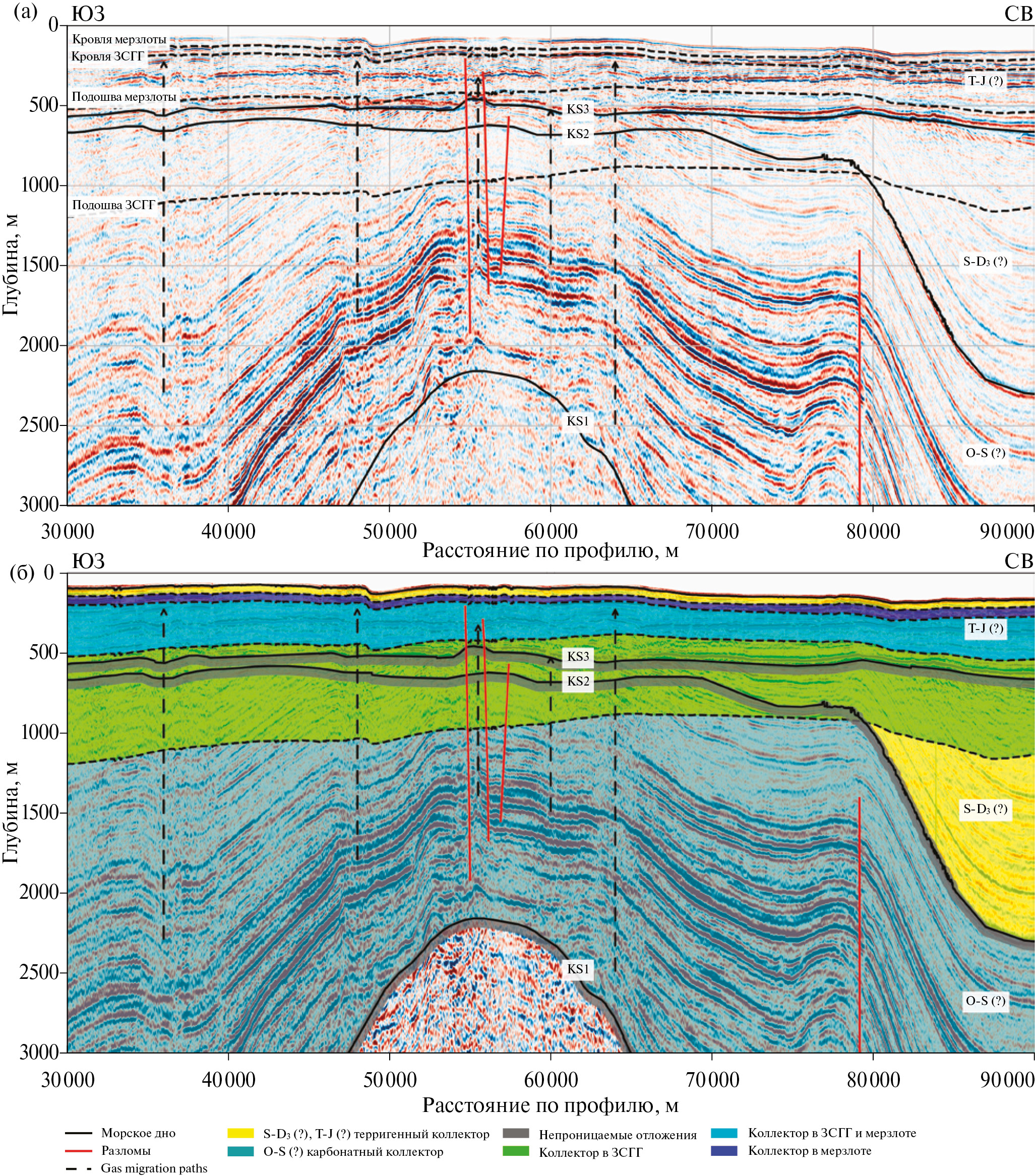 Отражающий горизонт F соответствует поверхности акустического фундамента архей‒протерозойского возраста; горизонты KS-1, KS-2 и KS-3 расчленяют палеозой‒мезозойский осадочный чехол на ряд сейсмических комплексов.
