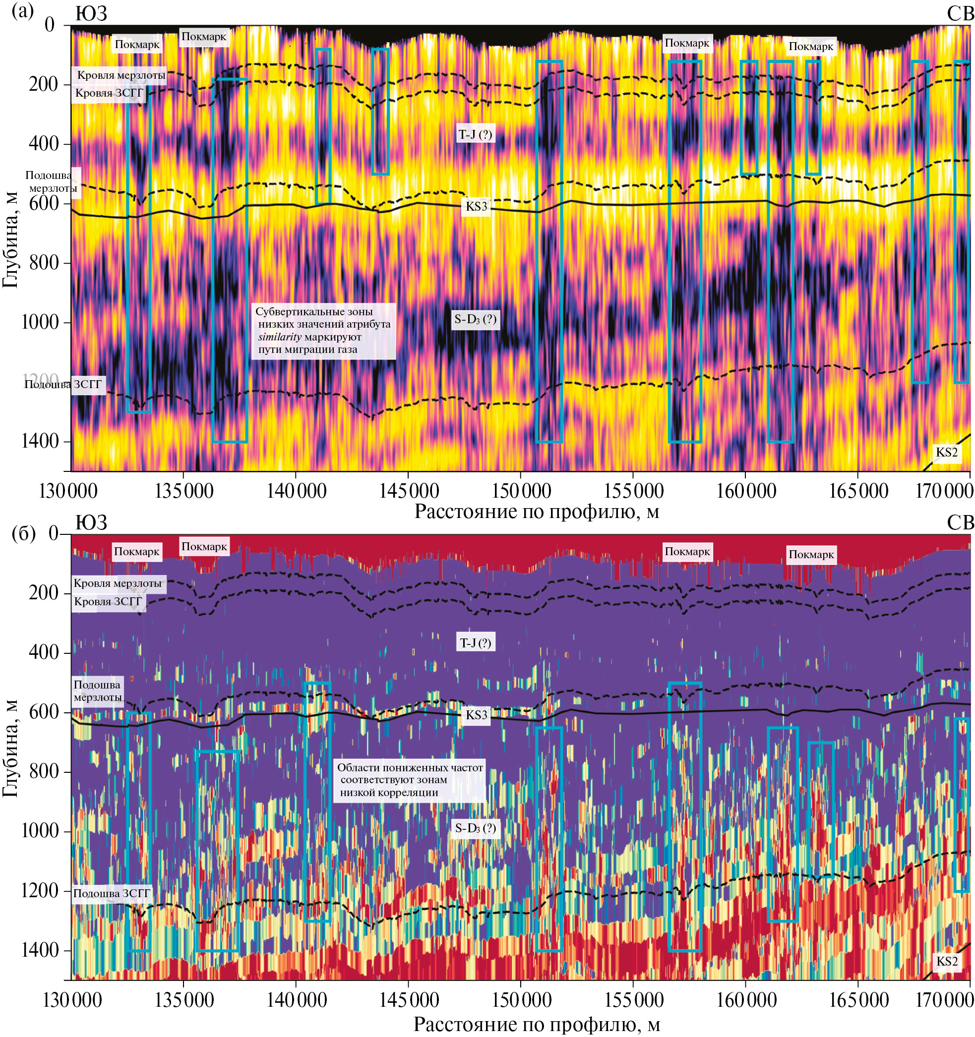 В сводовой части поднятия наблюдаются усиление амплитуд отраженного сигнала, ниже сводовой части определяется вертикальная зона сниженной коррелируемости отражений, что свидетельствует о возможной миграции газа в антиклинальную структуру. Поскольку подошва мерзлоты не проявлена на сейсмическом разрезе, мы полагаем, что это ‒ подмерзлотное скопление газогидратов.