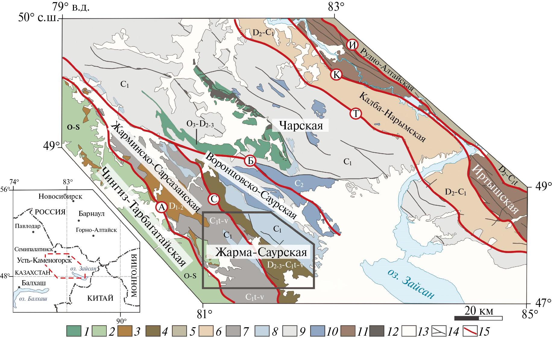 1–2 – нижне-среднепалеозойские вулканогенно-осадочные отложения в зонах: 1 – Чарская (O3‒D2-3), 2 – Чингиз-Тарбагатайская (O‒S); 3 – нижне-среднедевонские вулканогенные отложения среднекислого состава (D1-2); 4–5 – средне-верхнепалеозойские вулканогенно-осадочные отложения в зонах: 4 – Жарма-Саурская (D2-3‒С1t-v), 5 – Рудно-Алтайская (D2‒С1t); 6 – девон‒каменноугольные осадочные отложения Калба-Нарымской зоны; 7–8 – нижнекаменноугольные вулканогенно-осадочные отложения Жарма-Саурской зоны: 7 – коконьской и сиректасской свит нерасчлененные (С1t-v), 8 – кояндинской и терсайрыкской свит нерасчлененные (С1); 9 – осадочные отложения (С1); 10 – моласса (C2); 11 – меланж Иртышской зоны смятия; 12 – серпентинитовый меланж в Чарской зоне; 13 – кайнозойские отложения; 14 – крупные разломы; 15 – структурные границы зон и подзон