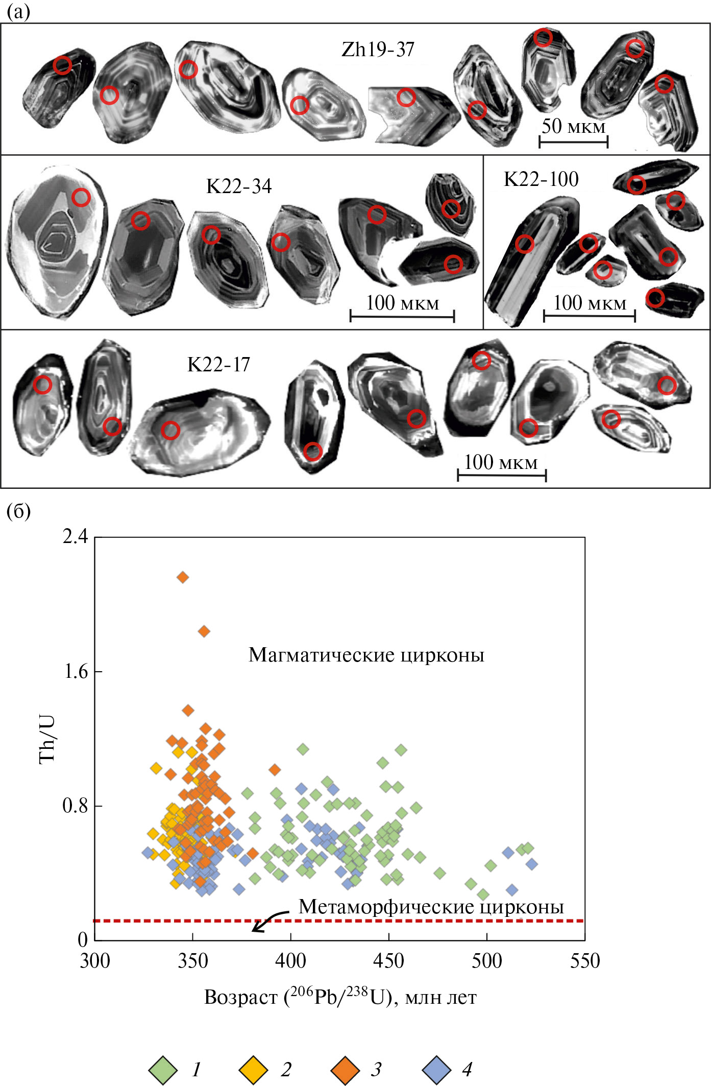 U‒Pb изотопные отношения нормализовали на соответствующие значения изотопных отношений стандартных цирконов 91 500 [62] и Plešovice [59]. Погрешности единичных анализов (отношений, возрастов) и вычисленных конкордантных возрастов приведены на уровне 2σ. Расчет средневзвешенных значений возраста по изотопным отношениям, построение гистограмм с плотностью относительной вероятности выполнялись в Microsoft Excel со встроенным пакетом Isoplot 4.15 [50].