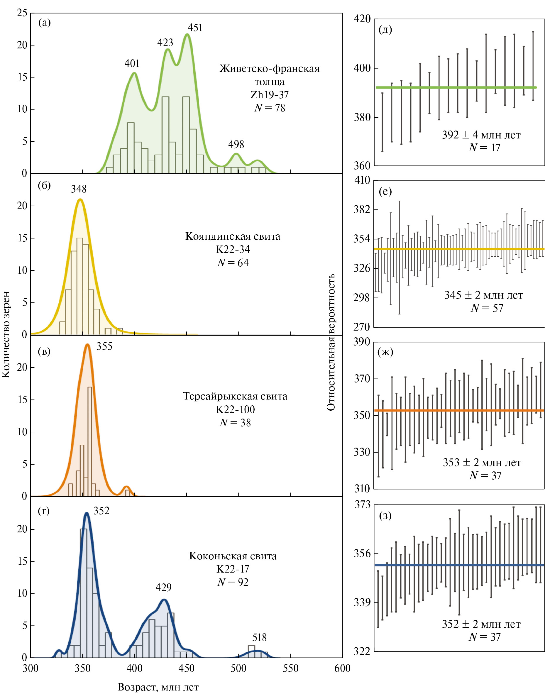 По результатам U‒Pb датирования детритовых цирконов формирование средне-позднедевонских песчаников (живет‒фран) Жарма-Саурской островодужной зоны происходило вследствие разрушения раннепалеозойских источников, а возрастные пики совпадают с этапами вулканической активности и гранитообразования в пределах Чингиз-Тарбагатайской зоны [9] (см. рис. 13).