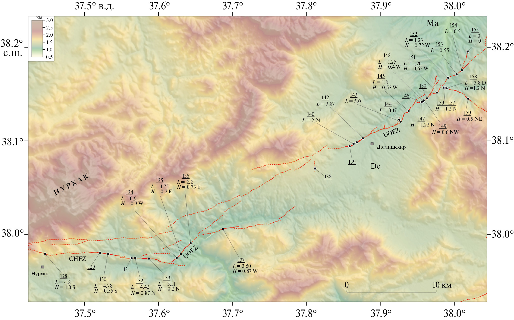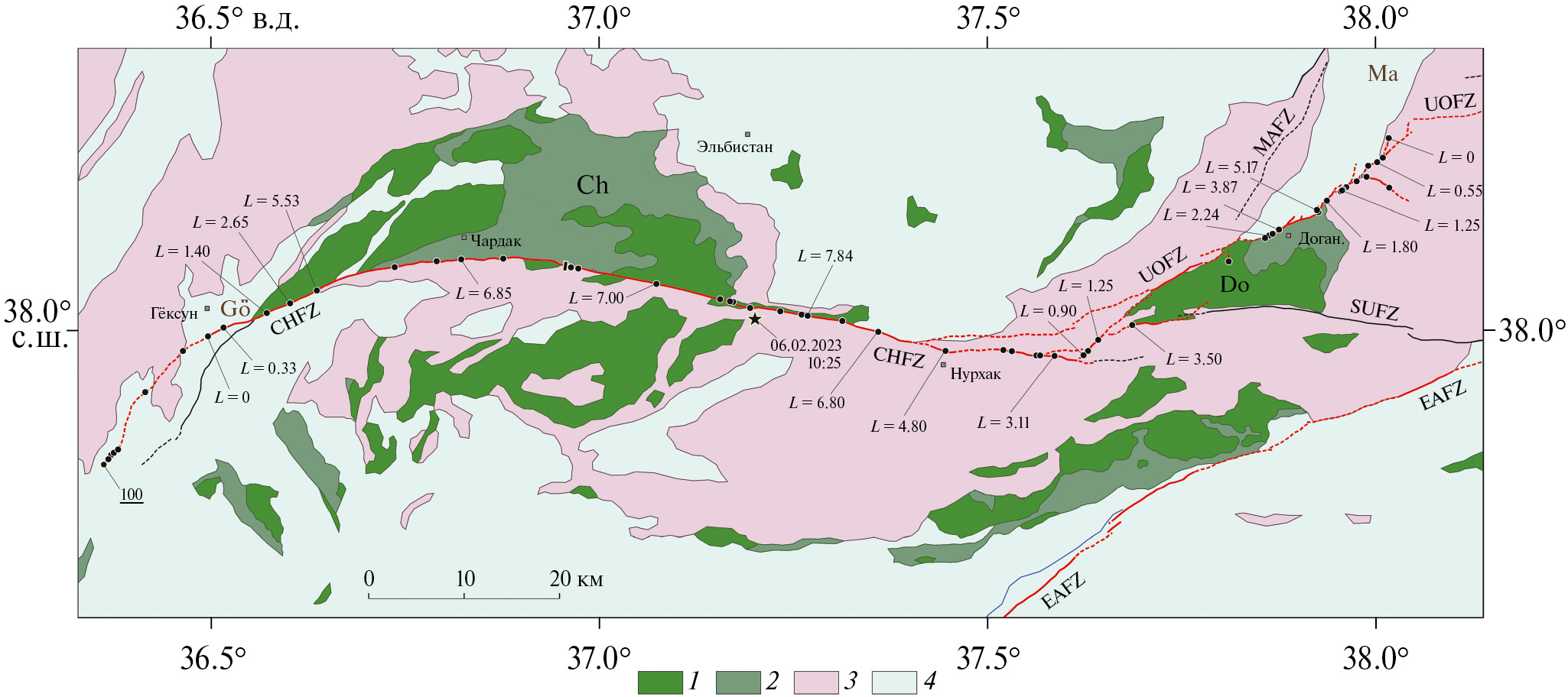 При Эльбистанском землетрясении были активизированы соседние сегменты зон разломов Чардак и Улуова, причем разлом Улуова ранее считался неактивным [14] (рис. 1). По возникшим сейсморазрывам на отрезке длиной 148 км произошли левосдвиговые смещения.