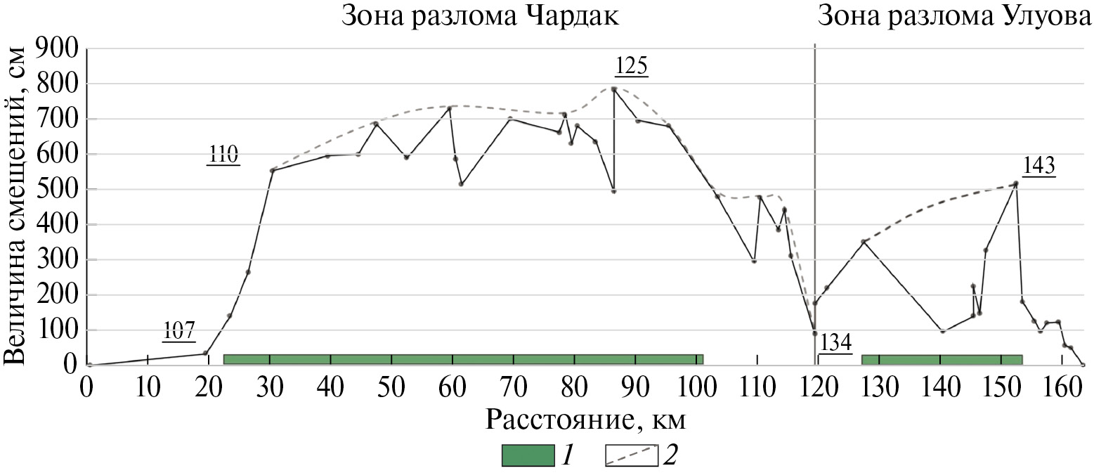 Рис. 10. График распределения величин левосдвиговых смещений вдоль Чардак и Улуова.