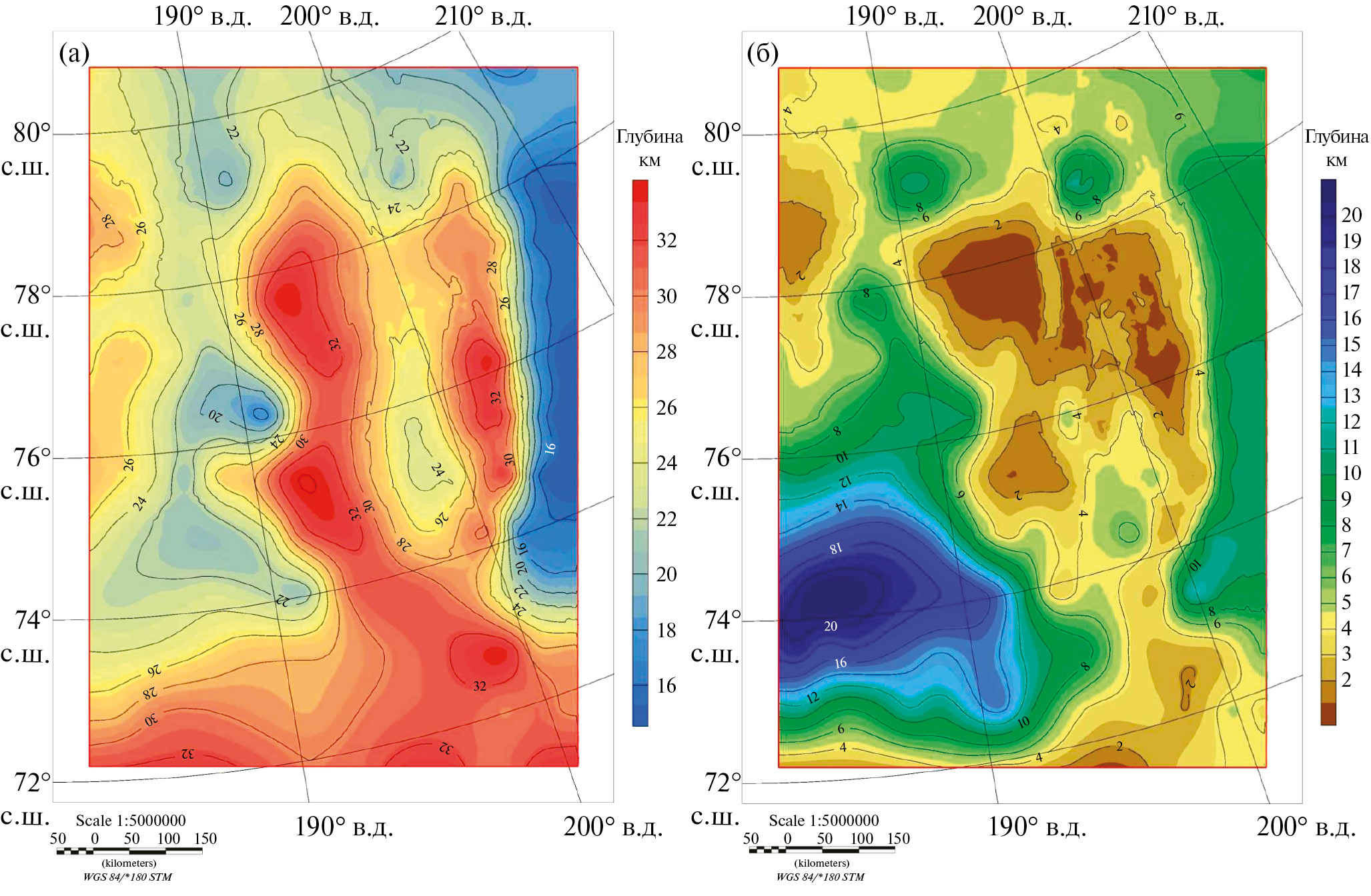 ‒ верхняя/средняя кора мощностью 3–6 км (наименьшая мощность 3–4 км под Чукотским бассейном);