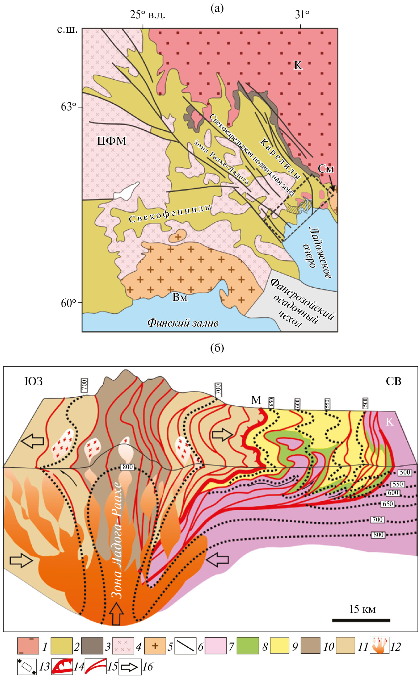 (а) – Схема геологического строения Свеко-Карельской подвижной зоны; (б) – палео-реконструкция строения Северного Приладожья. Крупные структуры: ЦФМ – Центрально-Финляндский массив; К – Карельский массив; М – Мейерская зона, разделяющая комплексы карелид и свекофеннид; массивы: См – Салминский, Вм – Выборгский. Показан (прямоугольник пунктиром) район исследования.