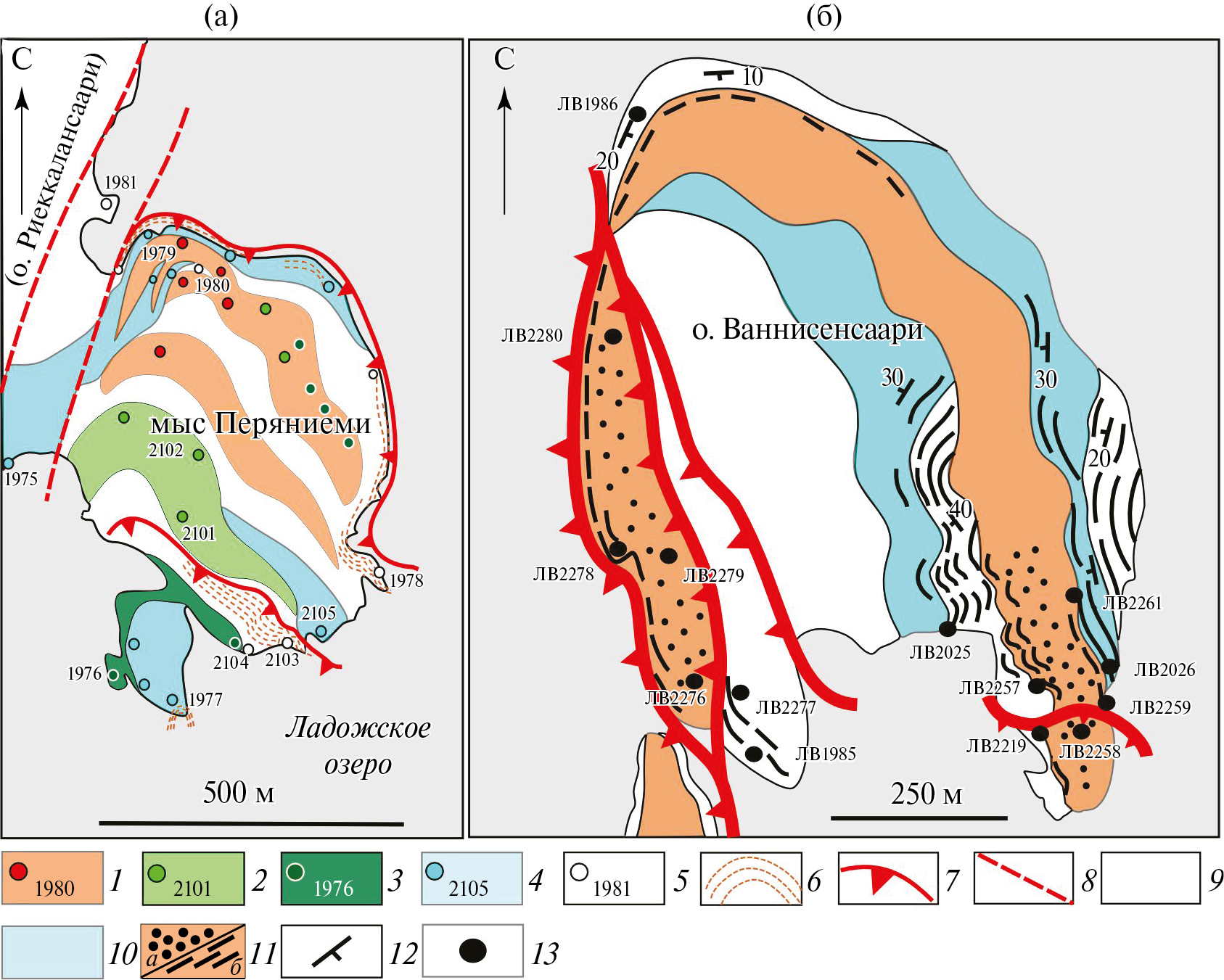 1‒3 – пластинчатые интрузии с точками отбора проб: 1 – гранодиоритов, 2 – диоритов, 3 – габбро; 4‒5 – вмещающие гнейсы ладожской серии с точками отбора проб: 4 ‒ гранат-содержащие гнейсы, 5 – слюдистые гнейсы; 6 – зоны разломных хлоритовых тектонитов; 7 ‒ надвиги; 8 – поздние разломы; 9 – слюдистые гнейсы; 10 – гранат-содержащие гнейсы; 11 – гранодиориты: а ‒ массивные, б ‒ огнейсованные; 12 – элементы залегания расслоенности, 13 – точки отбора проб