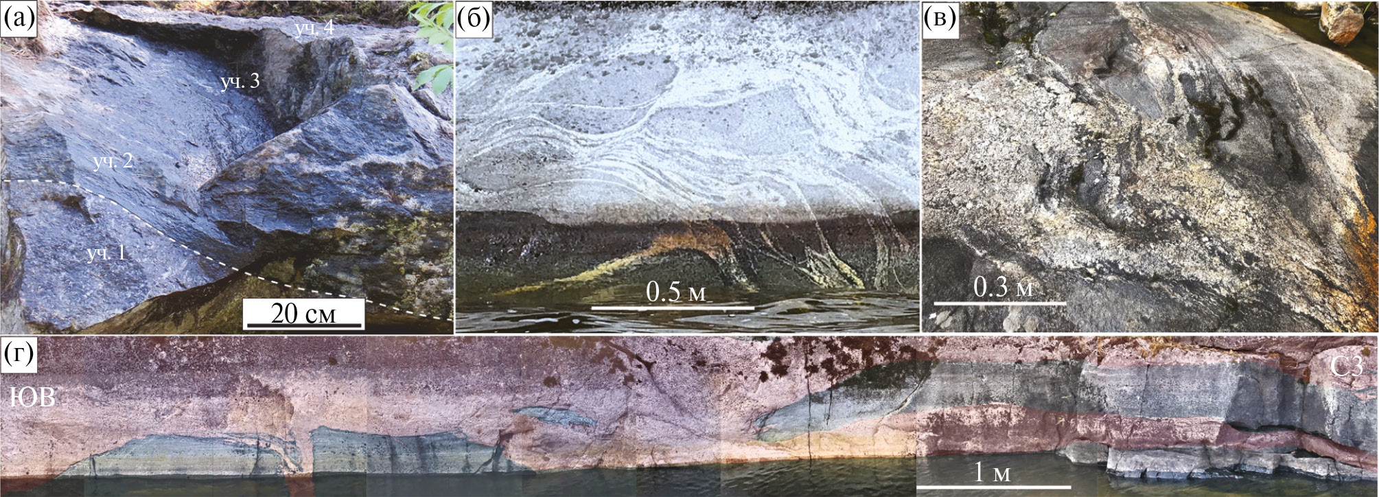 Вдоль осевых поверхностей этих складок и кулисно-эшелонированно по отношению к пологим разрывным нарушениям локализуются интрузивные пластиноподобные тела широкого спектра составов (габбро, диориты, гранодиориты, плагиограниты). По нашему мнению, они формируют единую систему, встроенную в структурный парагенез покровно-складчатого ансамбля раннего этапа тектогенеза, и маркируют надвиго-правосдвиговую кинематику смещений по разломам. Пологое залегание от ∟10° до ∟30° интрузивных пластиноподобных тел, значительная протяженность от сотни метров и до первых километров при мощности от нескольких метров до первых десятков метров, а также субсогласные или кососекущие соотношения с расслоенностью вмещающих гнейсов ладожской серии позволяют относить их к силлоподобным интрузивным формам [23] (см. рис. 3, г). Именно по устойчивому сочетанию деформационных элементов структурного парагенеза этого раннего этапа нами были определены современные геологические границы Мейерской зоны [27] (см. рис. 2).