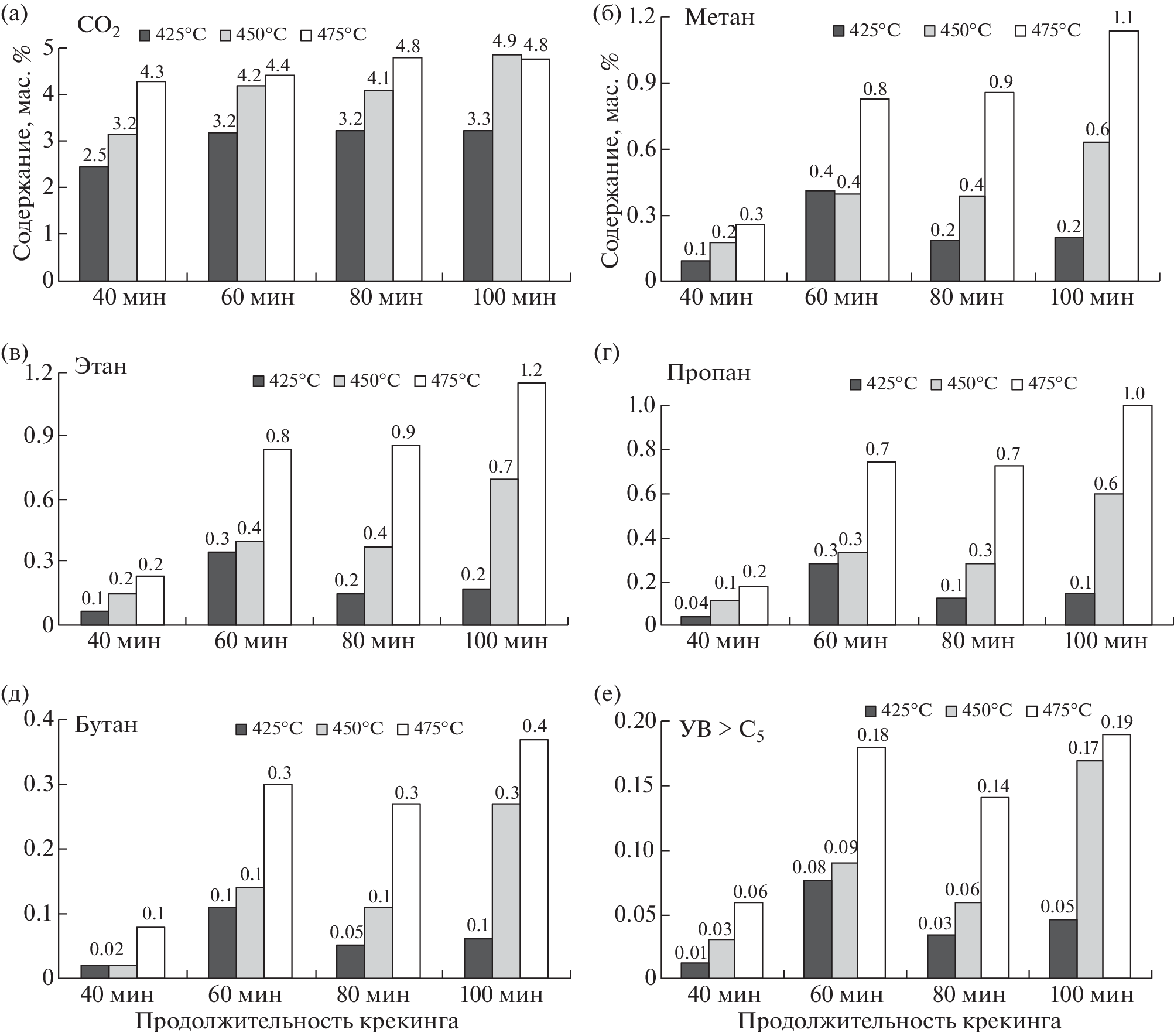 The cracking of oil shale from the Kashpir deposit was studied at various temperatures (425, 450, and 475°C) and process durations (40, 60, 80, and 100 min.). It was shown that the highest yields of liquid products and oils in their composition were achieved at a cracking temperature of 450°C and a duration of 100 min. An increase in the temperature and duration of cracking led to an increase in the concentration of С1–С5 hydrocarbons in the gaseous products by a factor of 2–5. Oils isolated from the liquid products of oil shale cracking consisted of 30–45% polycyclic aromatic hydrocarbons. It was established that an increase in the temperature and duration of cracking led to an increase in the concentration of IBP–360°C fractions in the composition of liquid products.