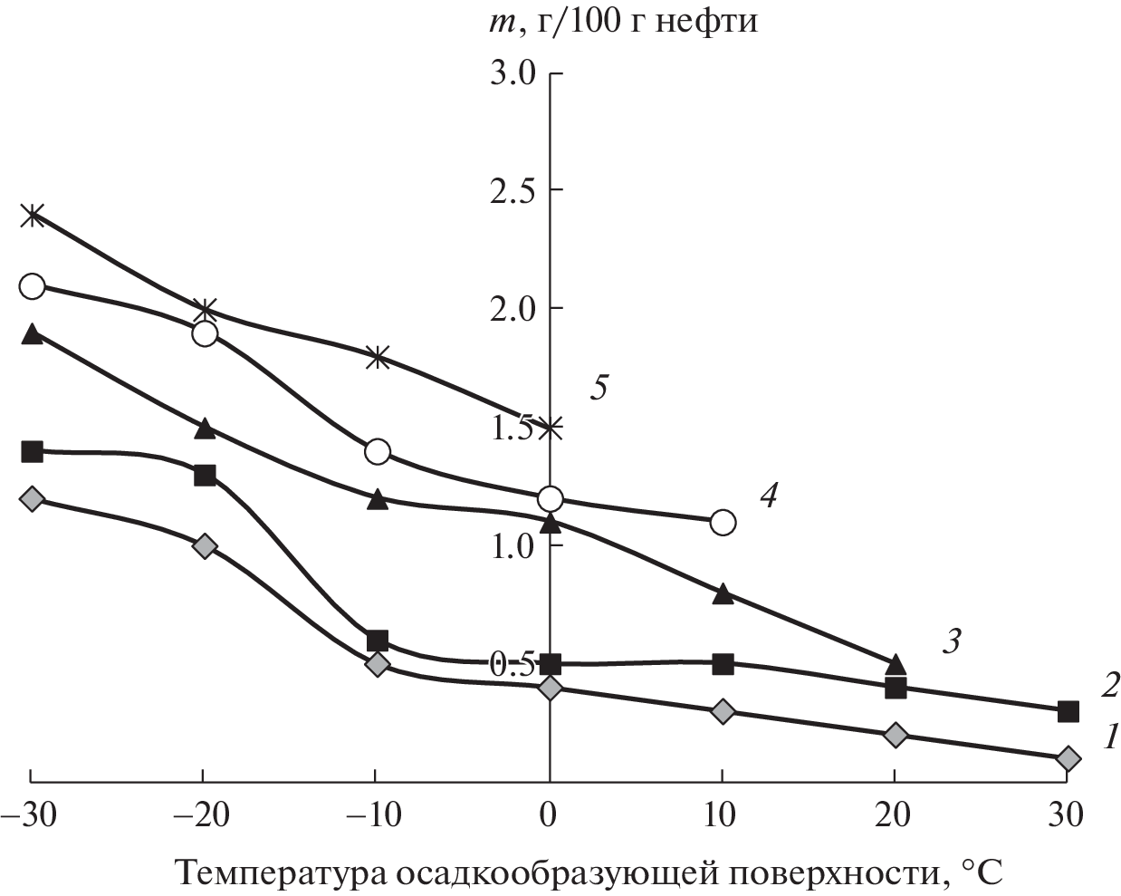The study of the distribution of sediment formed from test oil on the sediment-forming surface at different temperature gradients was typical for resinous oils: the amount of oil sediment increased with decreasing oil temperature, and its maximum corresponded to temperatures closest to the pour point of oil. The properties and structure of oil sediments, which differed in sampling sites and methods, were greatly influenced by the thermodynamic conditions of sedimentation. In sediments taken directly from a well and formed in dynamic mode at higher temperatures for a short time period, the asphaltene content was lower than that in oil sediments from a receiving tank. In samples taken at the surface and formed at low temperatures for a longer period, the amount of paraffinic hydrocarbons was significantly higher than that in the sediments from the well.