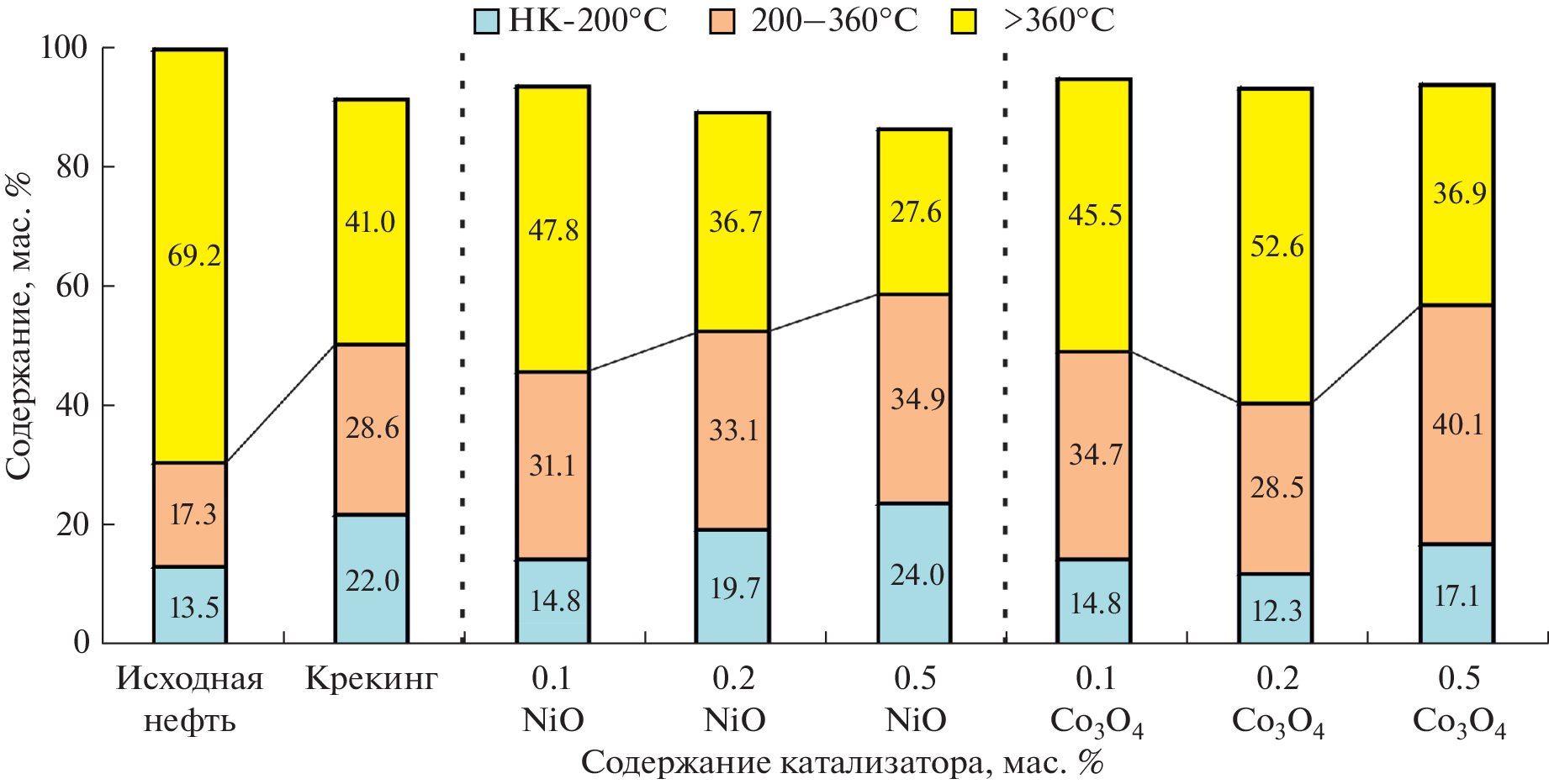The influence of the amount of precursors of cobalt and nickel oxides on the composition and structure of catalytic cracking products of heavy oil from the Zyuzeevskoye field was studied. It was found that an increase in the amount of a loaded precursor led to the destruction of a larger amount of resin–asphaltene components and the yield of an IBP–360°C fraction. It was established that nickel-containing catalysts facilitated the destruction of 66% high-molecular-weight components, and cobalt-containing catalysts contributed to a low yield of by-products. The structural group analysis of initial oil asphaltenes and those formed after thermal and catalytic cracking was studied. A possible mechanism of the reactions was presented based on the experimental data.