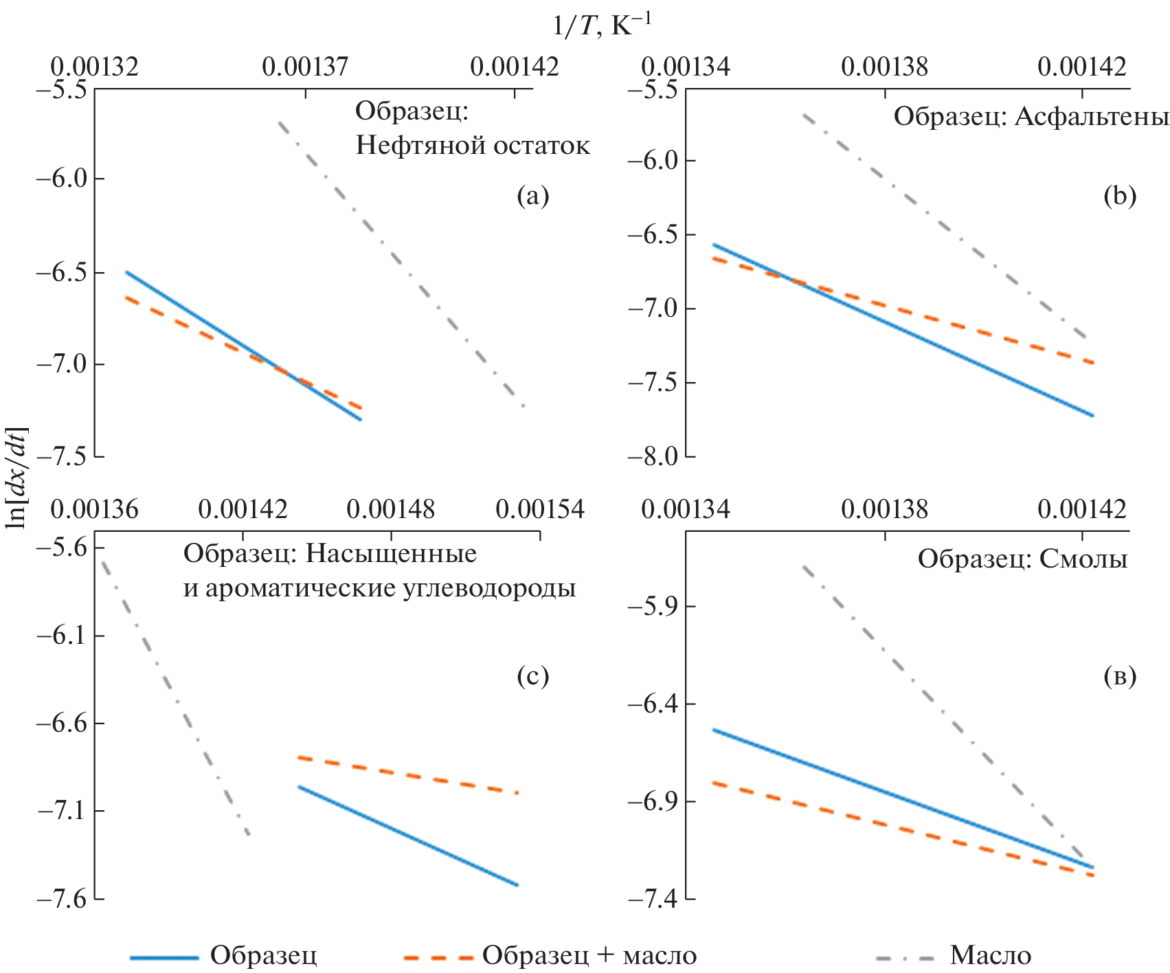 Dynamic thermogravimetry was used to study the thermal degradation of the oil residue of Usinskaya oil and its saturated, aromatic, resin, and asphaltene (SARA) fractions in the presence of sunflower oil. Thermolysis experiments were carried out in an atmosphere of pure argon. Based on the data of thermogravimetric analysis, the activation energies of the thermal degradation of the oil residue, resins, asphaltenes, saturated and aromatic hydrocarbons, and their mixtures with sunflower oil were calculated in the temperature range of a maximum weight loss rate. It was shown that the addition of 10.0 wt % sunflower oil to the oil residue and its components led to a decrease in the activation energy. This fact indicates that the sunflower oil additive affected the mechanism of thermal degradation of crude oil and its components. The greatest change in the activation energy was observed for asphaltenes: ΔЕа = 48.4 kJ/mol.