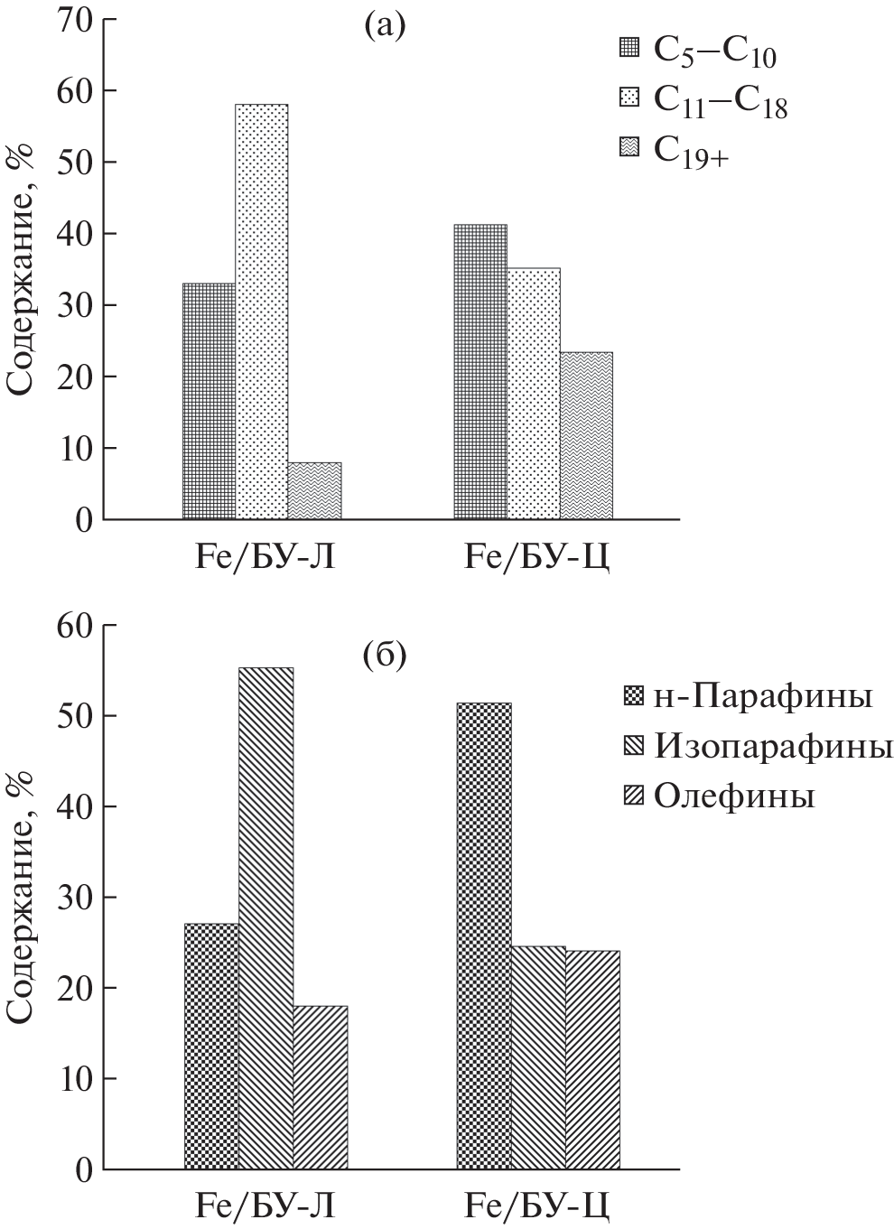Supported iron catalysts based on a carbon-containing material, biochar obtained by the hydrothermal carbonization of biopolymers (cellulose and lignin), were studied. The catalytic systems showed high activity in the Fischer–Tropsch synthesis. A composition of C5+ liquid products, uncharacteristic for ironcontaining catalysts, characterized by high isoalkane content (up to 55%) was recorded. This fact was discussed in the context of the theory of bifunctional centers proposed by A.L. Lapidus with coworkers. It was suggested that the active centers of the test catalysts can be considered bifunctional (a carbide phase and an oxide phase). A correlation between the Fischer–Tropsch synthesis data on the test catalysts and the data obtained by Lapidus and coworkers on cobalt-containing catalysts was shown.