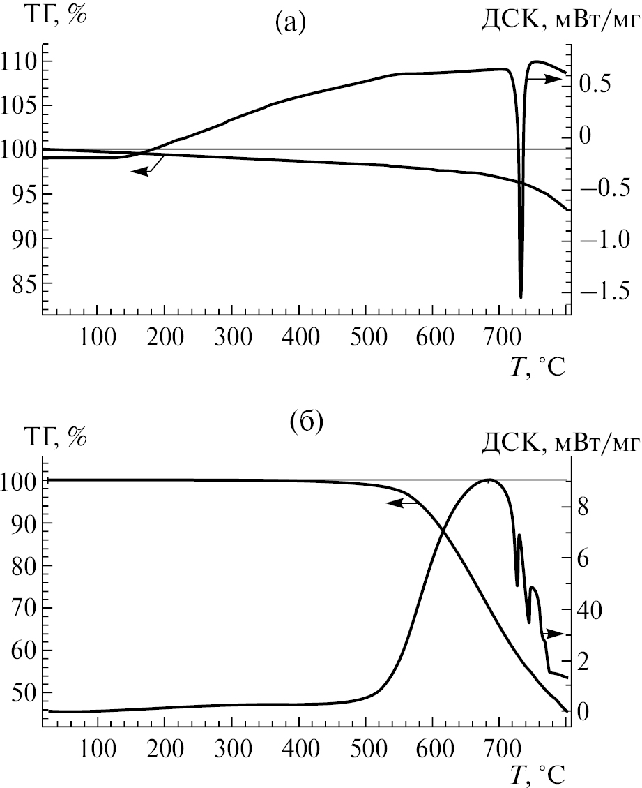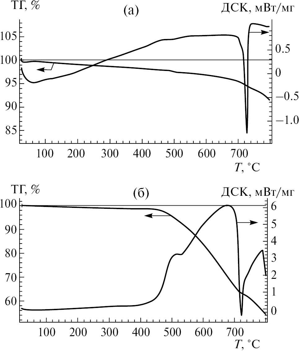 Термический анализ (ДСК) проводили с помощью синхронного анализатора “STA 449 F1 Jupiter”. Чувствительность прибора по гравиметрии (ТГ) составляла 0.025 мкг. Измерения проводили в атмосфере аргона и на воздухе в режиме дифференциально-сканирующей калориметрии при скорости нагрева образцов 10°C/мин. Проводили коррекцию полученных кривых по ДСК и ТГ. При проведении коррекции в держателе образца находился тигель без вещества.