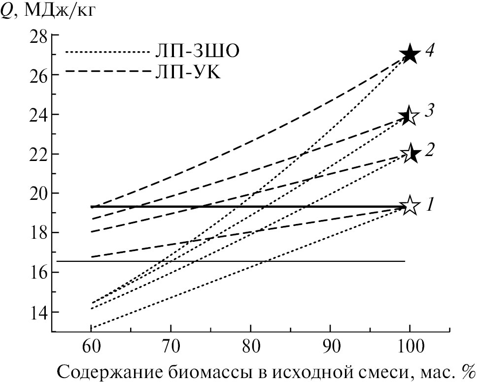 Как видно из табл. 2, ужесточение режимов торрефикации, выражающееся в увеличении температуры от 240°C до 300°C и приводящее к увеличению удельной теплоты сгорания торрефицированной биомассы, позволяет увеличить содержание ЗШО в смесях с ДО и ЛП на 7.8 и 8.5% соответственно, а содержание УК – на 12.3 и 13.1%.