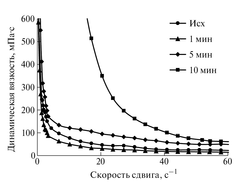 Для исходной нефти наблюдается высокая степень структурированности системы в диапазоне скоростей сдвига от 0.1 до 60 с−1 (рис. 1). При дальнейшем увеличении скорости сдвига структура разрушается, и система приобретает свойства ньютоновской жидкости. Как видно из рис. 1, только кратковременная УЗО в течение 1 мин приводит к снижению вязкости нефти во всем диапазоне скоростей сдвига. Максимальная депрессия вязкости достигается в области малых скоростей сдвига: при скорости сдвига 3 с−1 вязкость снижается в 1.5 раза (с 150 до 100 мПа с). При увеличении времени УЗО вязкость обработанной нефти растет, и после 10 мин эффективная вязкость при скорости сдвига 3 с−1 увеличивается в 10 раз по сравнению с исходной нефтью.