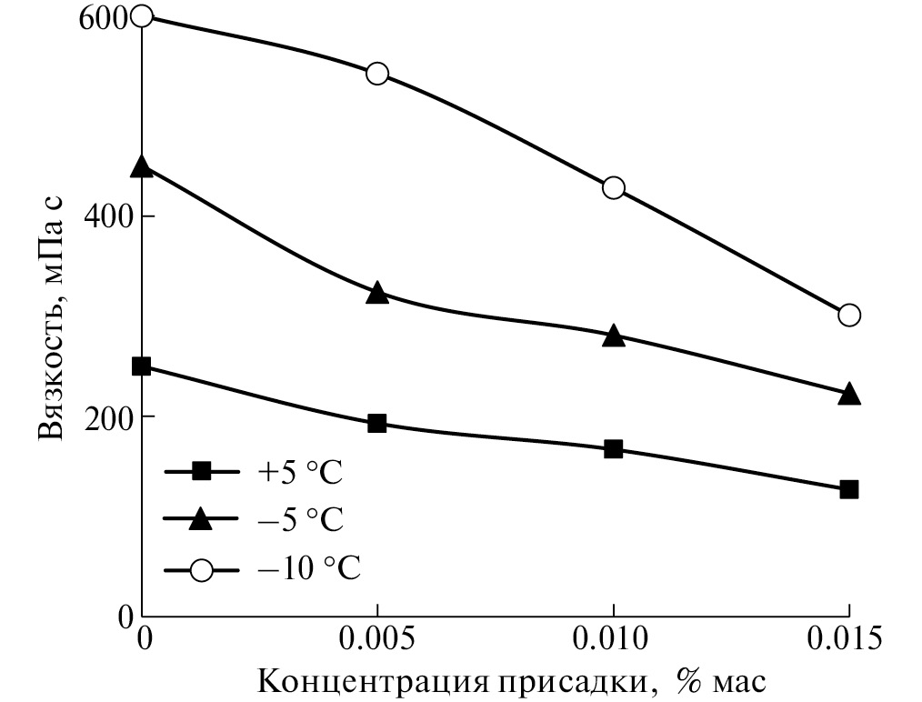 Присадка, введенная в нефть в концентрации 0.005 мас. %, снижает вязкость нефти на 23, 28 и 10% при температурах +5, −5 и −10°С соответственно (рис. 2). Увеличение концентрации ПП усиливает депрессорный эффект, причем снижение вязкости более заметно при значительных отрицательных температурах: при минус 10°С вязкость снижается в 2 раза в присутствии 0.015 мас. % ПП.