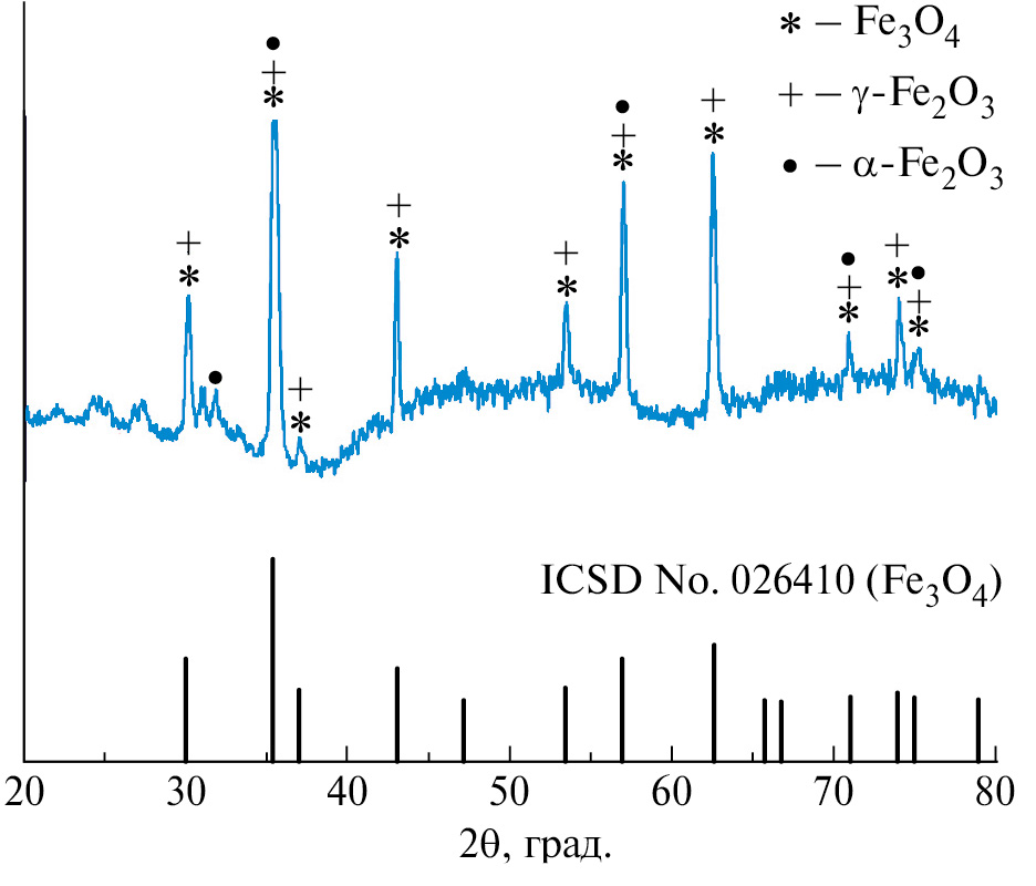 На рис. 2 представлена рентгенограмма частиц оксидов железа. Были обнаружены рефлексы, которые могут относиться к магнетиту (Fe3O4), маггемиту (γ-Fe2O3), а также гематиту (α-Fe2O3). При использовании постоянного магнита было обнаружено наличие частиц оксидов железа, содержащих компоненты с магнитными свойствами, аналогичными тем, которые характерны для магнетита и маггемита. На рис. 3, б показано, что основная масса частиц притягивается магнитом. Частицы, на которые магнит не оказал воздействия, скорее всего, преимущественно содержат гематит.
