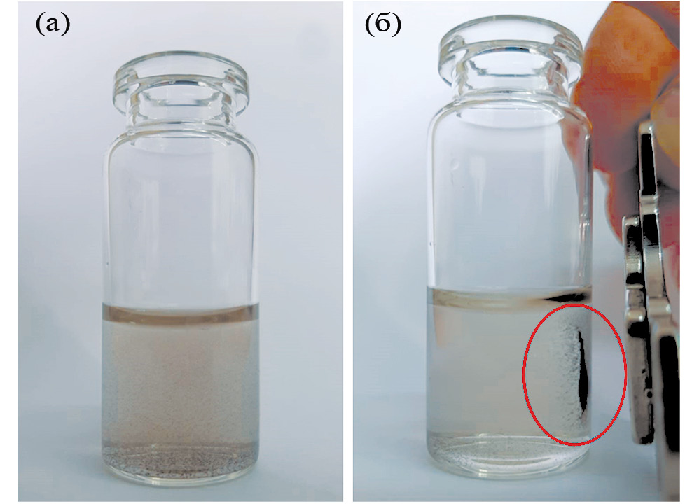 Рис. 3. Частицы оксидов железа, полученные из трис-ацетилацетоната железа (III) в среде СКВ при Т = 450°C: равномерно распределенные частицы в объеме воды (а); распределение частиц при поднесении магнита (б)