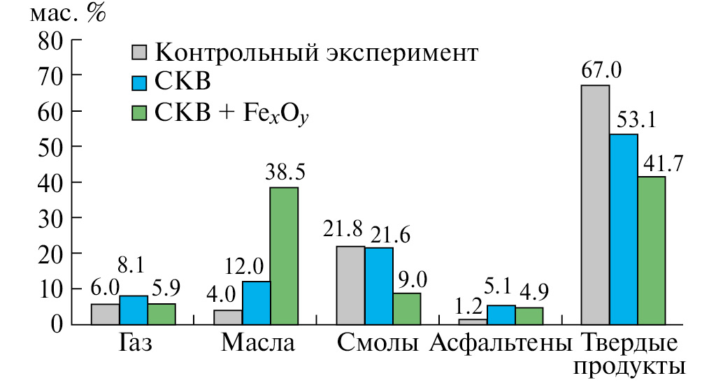 Состав продуктов термолиза асфальтенов представлен на рис. 4. Продукты термолиза асфальтенов разделялись по агрегатному состоянию и сорбционной способности на газ, масла, смолы, асфальтены и твердые коксоподобные продукты (продукты, нерастворимые в хлороформе). Выход продуктов термолиза приводили к 100%. При проведении контрольного эксперимента – без воды и катализатора асфальтены почти полностью (1.2 мас. %) трансформируются с образованием различных продуктов. Отсутствие воды и катализатора приводит к высокому выходу твердых продуктов (67.0 мас. %) и низкому выходу масел (4.0 мас. %).