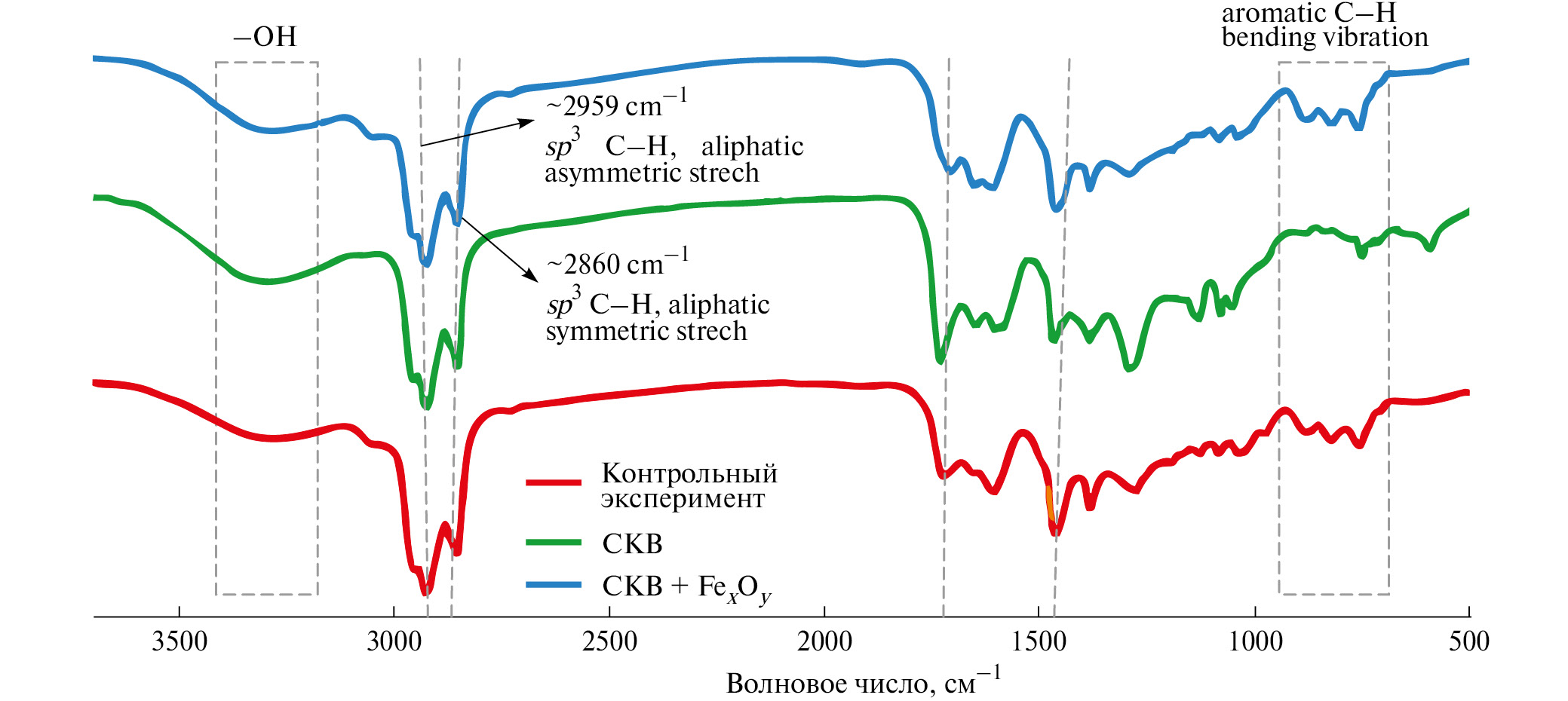 Два интенсивных пика в области поглощения ~2920 и 2854 см–1 свидетельствуют о наличии валентных колебаний CH2- и CH3- групп, интенсивность этих полос поглощения снижается при термолизе в среде СКВ, что связано с сокращением количества насыщенных заместителей. Полоса поглощения (ПП), наблюдаемая в области ~3400 см–1 , может относиться к валентным колебаниям O–H группы и N–H. Пик, наблюдаемый в области ~1680 см–1, был отнесен к валентным колебаниям –С=О и –СООН, интенсивность этой полосы возрастает при термолизе в СКВ, за счет внедрения кислорода из воды и оксида железа. Пик в области ~1376 см–1 относится к деформационным колебаниям метильных групп и характеризует степень разветвленности алкильных заместителей. Полоса поглощения низкой интенсивности во всех спектрах при ~1030 см–1 может соответствовать сульфоксидной группе SO. Область 750–900 см–1 относится к деформационным колебаниям СН- ароматических колец, интенсивность ароматического триплета заметно больше в асфальтенах, выделенных из продуктов термолиза в среде СКВ.