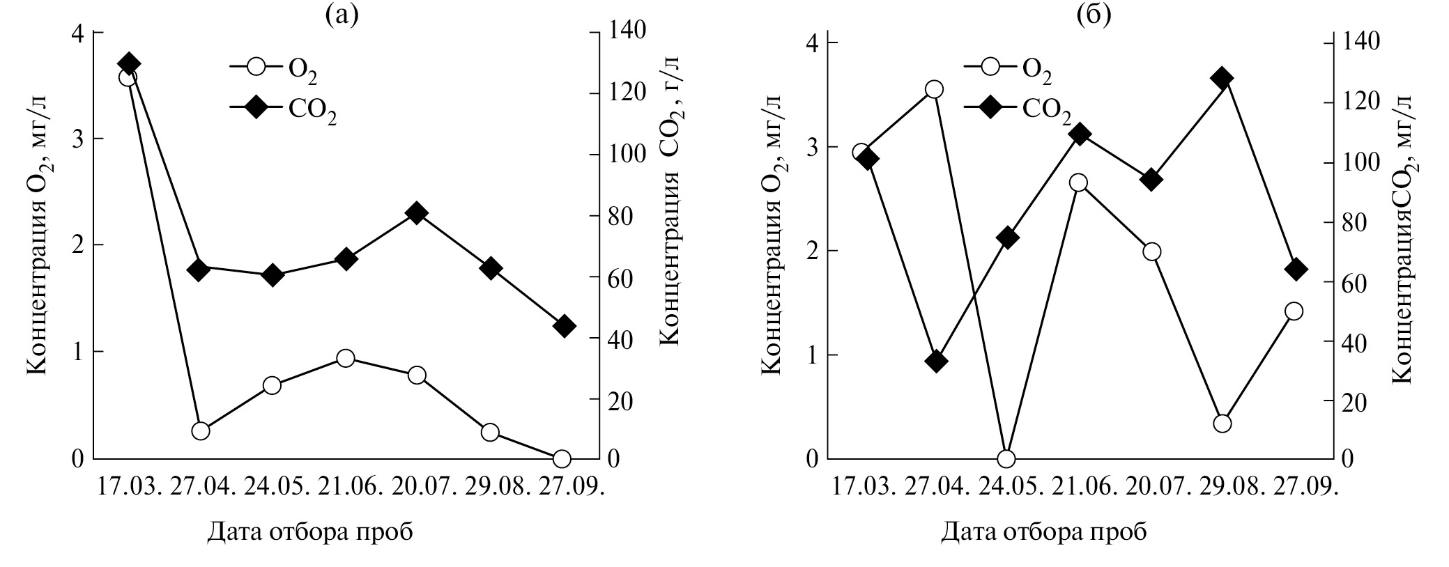 Рис. 1. Изменение концентрации растворенного О2 и СО2 в болотных водах осушенного фонового (а) и постпирогенного (б) участков Бакчарского болота в течение сезона