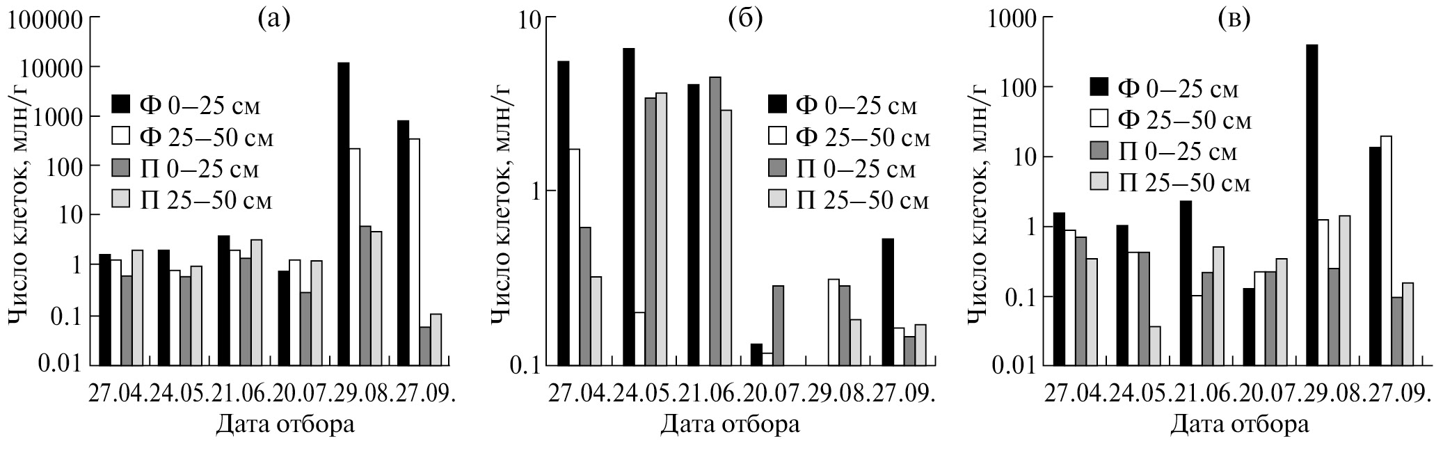 Рис. 5. Динамика численности олиготрофных (а), целлюлозоразрушающих (б) и углеводородокисляющих (в) бактерий в торфе осушенного фонового и постпирогенного участков Бакчарского болота в течение сезона 2022 г.