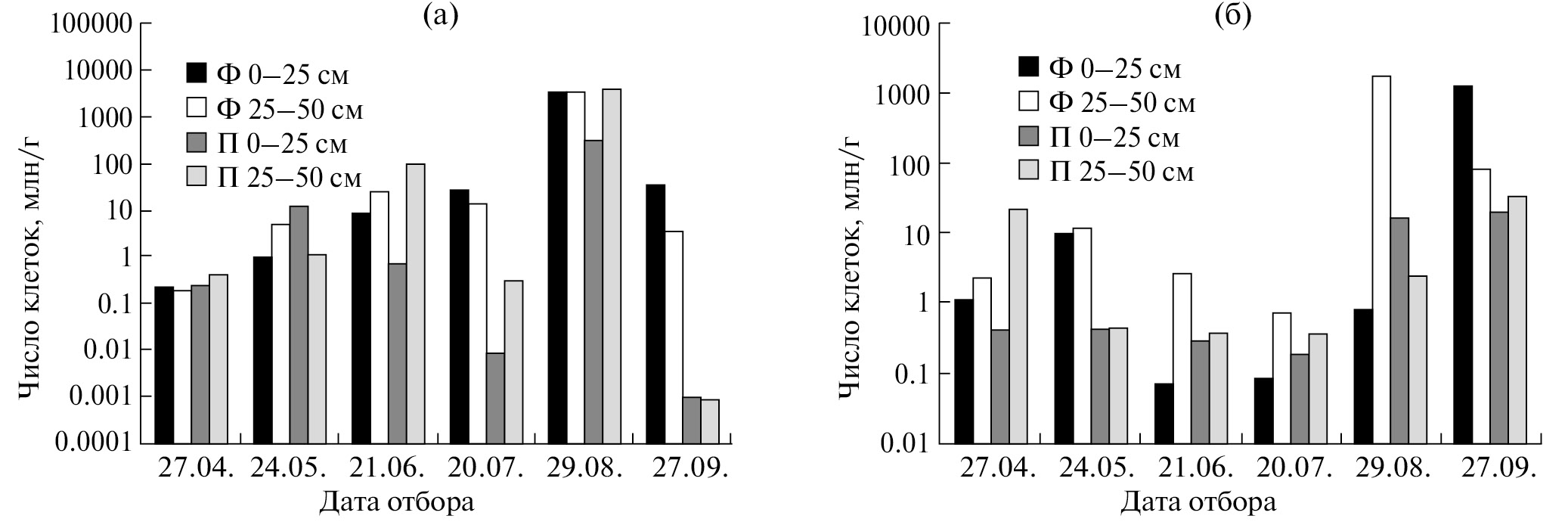 Рис. 6. Динамика численности денитрифицирующих (а) и сульфатредуцирующих (б) бактерий в торфе осушенного фонового и постпирогенного участков Бакчарского болота в течение сезона 2022 г.