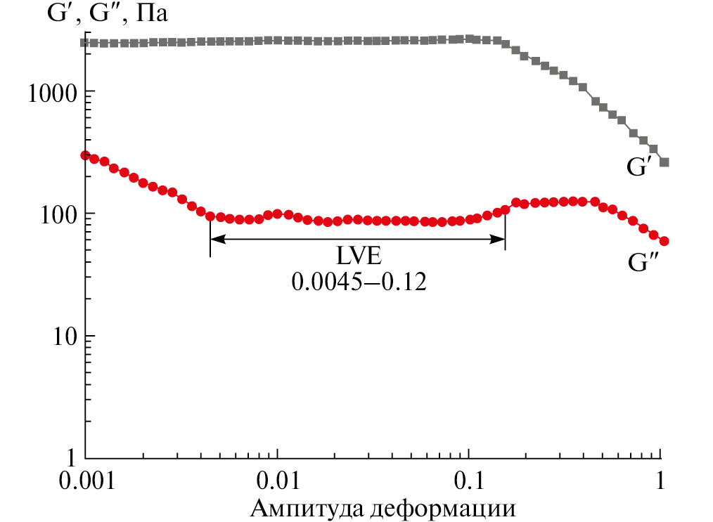 На рис. 2 приведены результаты амплитудного теста. По горизонтальной оси отложена величина амплитуды деформации в долях от единицы (безразмерная величина), по вертикальной – значения модулей накопления и потерь (Па). По результатам амплитудного теста определен диапазон линейной вязкоупругости, как область значений амплитуды деформации, при которых графики модулей накопления и потерь параллельны оси абcцисс и cоставляет от 0.0045 до 0.12 (выделен на рис. 2). Для дальнейших экспериментов выбрано значение деформации 0.01.
