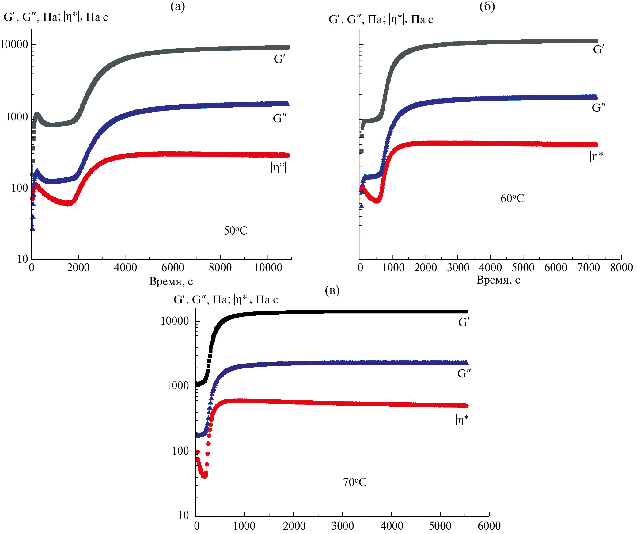 Рис. 3. Временные зависимости Gʹ, Gʹʹ и модуля комплексной вязкости |η*|, полученные в осцилляционном режиме при частоте 1 Гц, постоянном значении амплитуды деформации (0.01) при 50 (а), 60 (б) и 70°С (в)