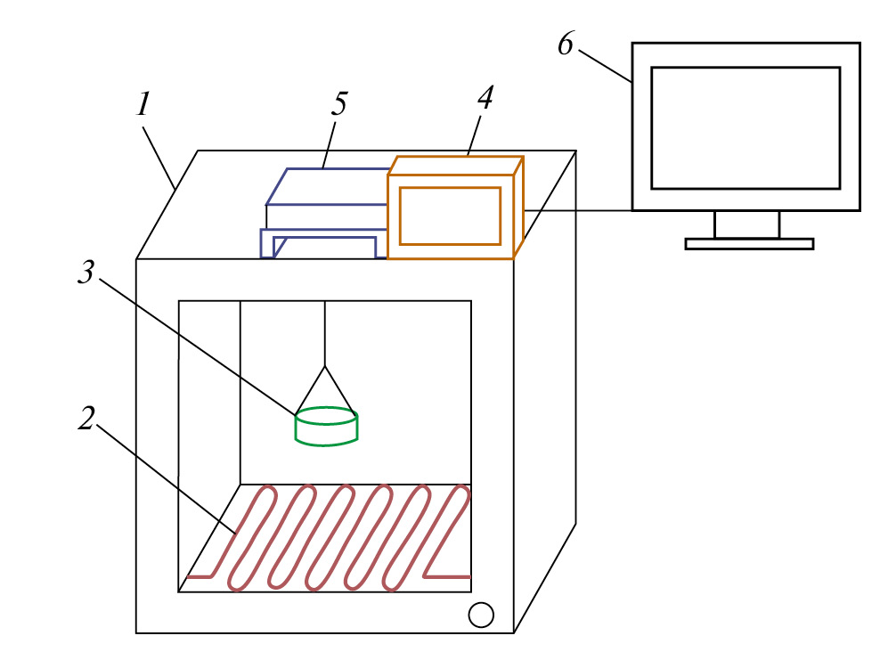Рис. 1. Принципиальная схема экспериментальной установки по осушению биомассы (1 – рабочая камера из нержавеющей стали, 2 – нагревательный элемент, 3 – поддон с хвоей кедра, 4 – блок управления сушильным шкафом, 5 – электронные весы, 6 – персональный компьютер).