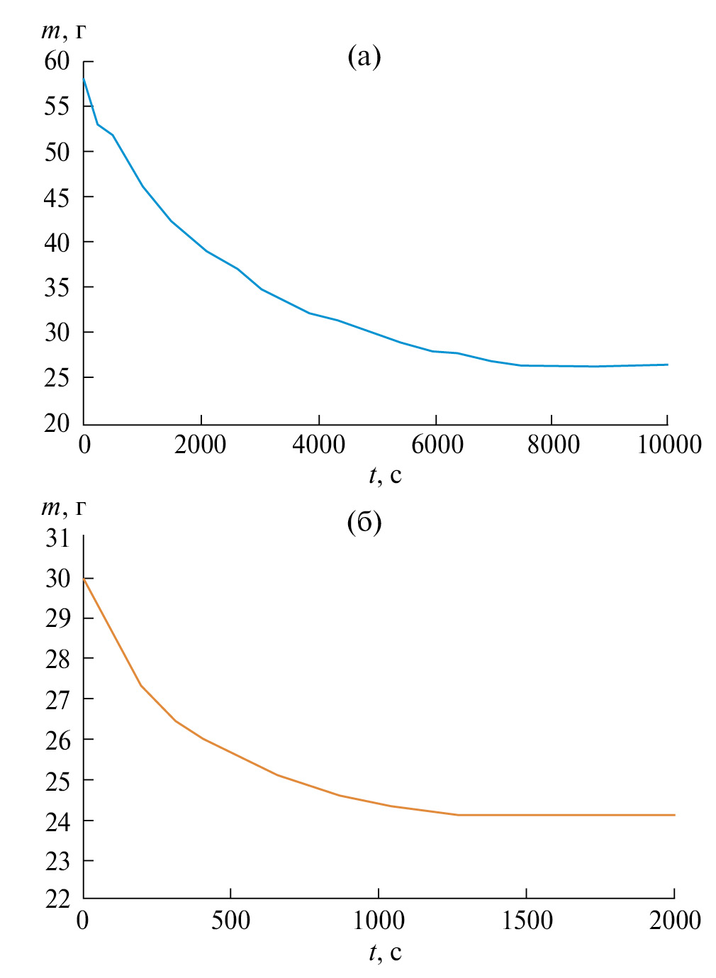 Рис. 6. Зависимость изменения массы хвои кедра (а – свежесрезанной, б – опавшей) от времени нахождения в сушильном шкафу t при температуре 373 К.