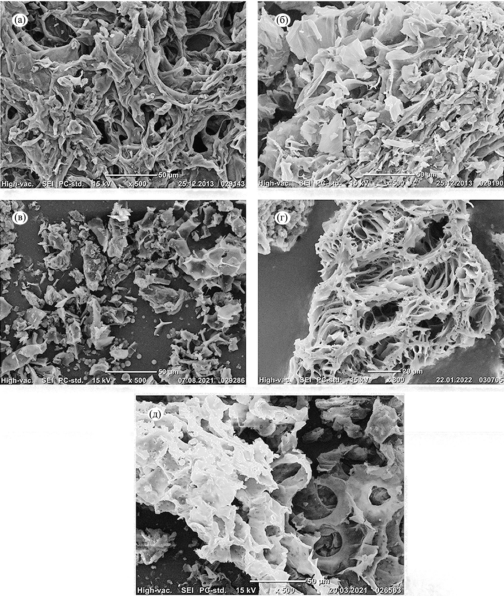Рис. 1. Результаты растровой электронной микроскопии углеродного остатка, полученного термической конверсией исходной биомассы: (а) углерод из цедры мандарина; (б) углерод из цедры помело; (в) углерод из кожуры банана; (г) углерод из скорлупы кедрового ореха; (д) углерод из скорлупы грецкого ореха.